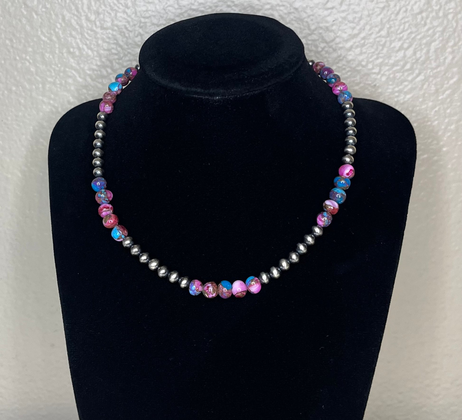 This bright and bold colored necklace is perfect for any look! It has 6mm Dahlia and 5mm Sterling Silver Navajo Pearls. 16”+ 2” extender.