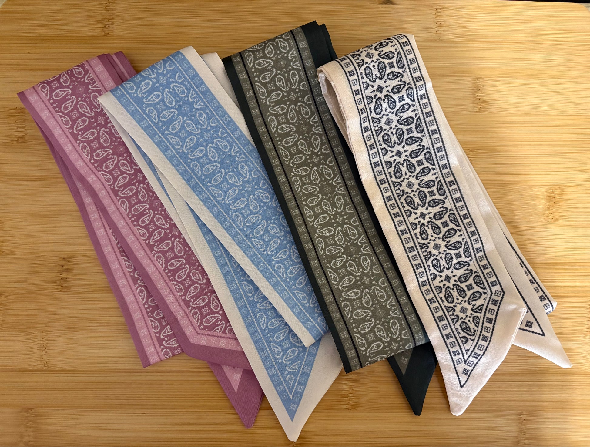 The Twilly trend is finally here! These are so much fun with so many different ways to style. Colors; Purple, Off White, Green, & Blue.