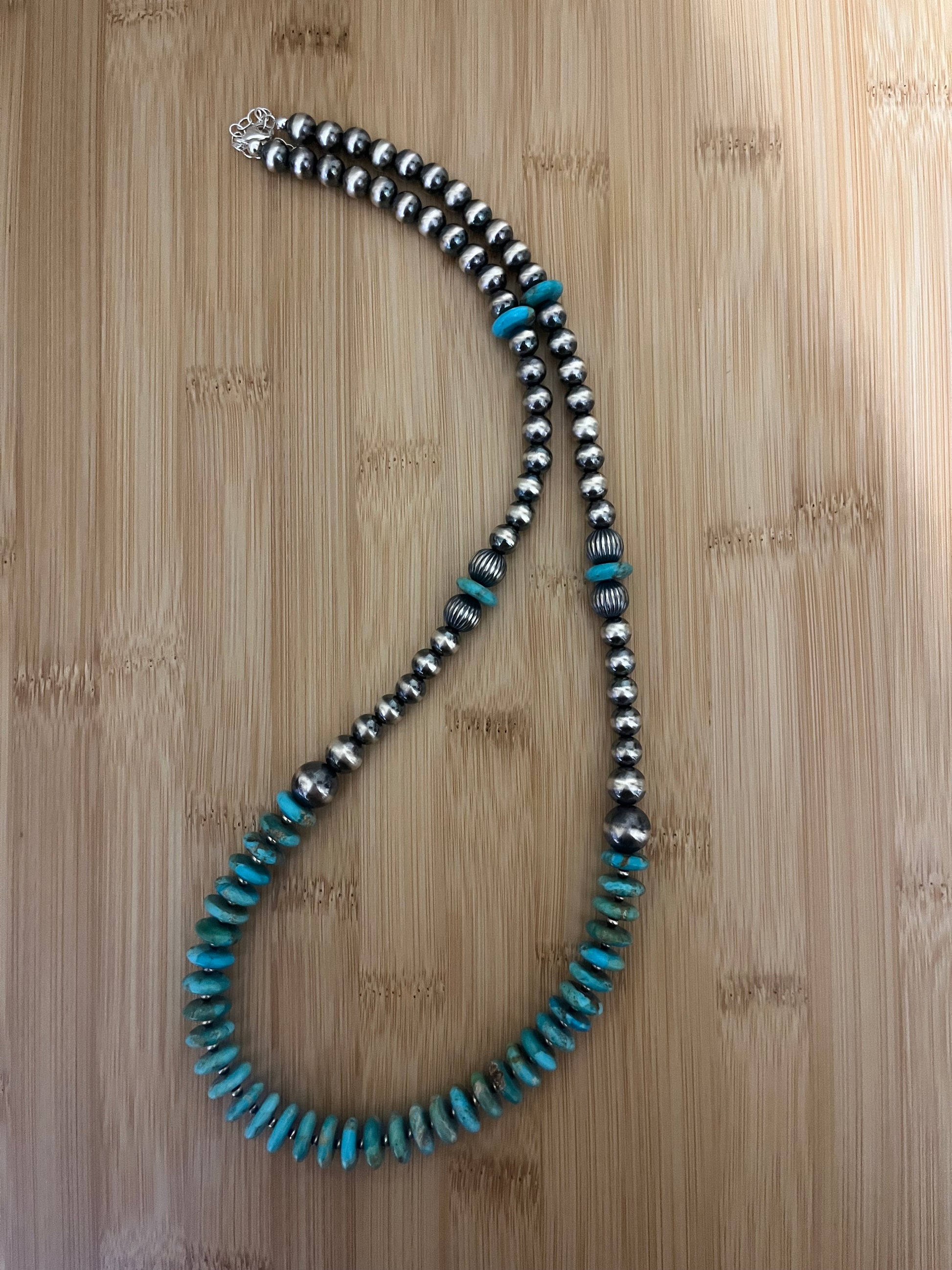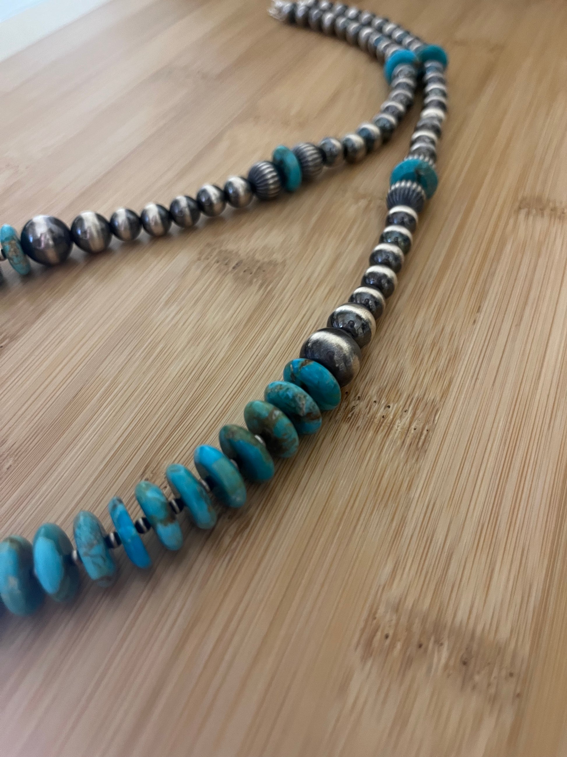 This necklace is nothing but stunning!!! Perfectly made with 12mm wafer Kingsman Turquoise and 12mm, 10mm, 10mm corrugated, 3mm, & 8mm Sterling Silver Navajo Pearls.