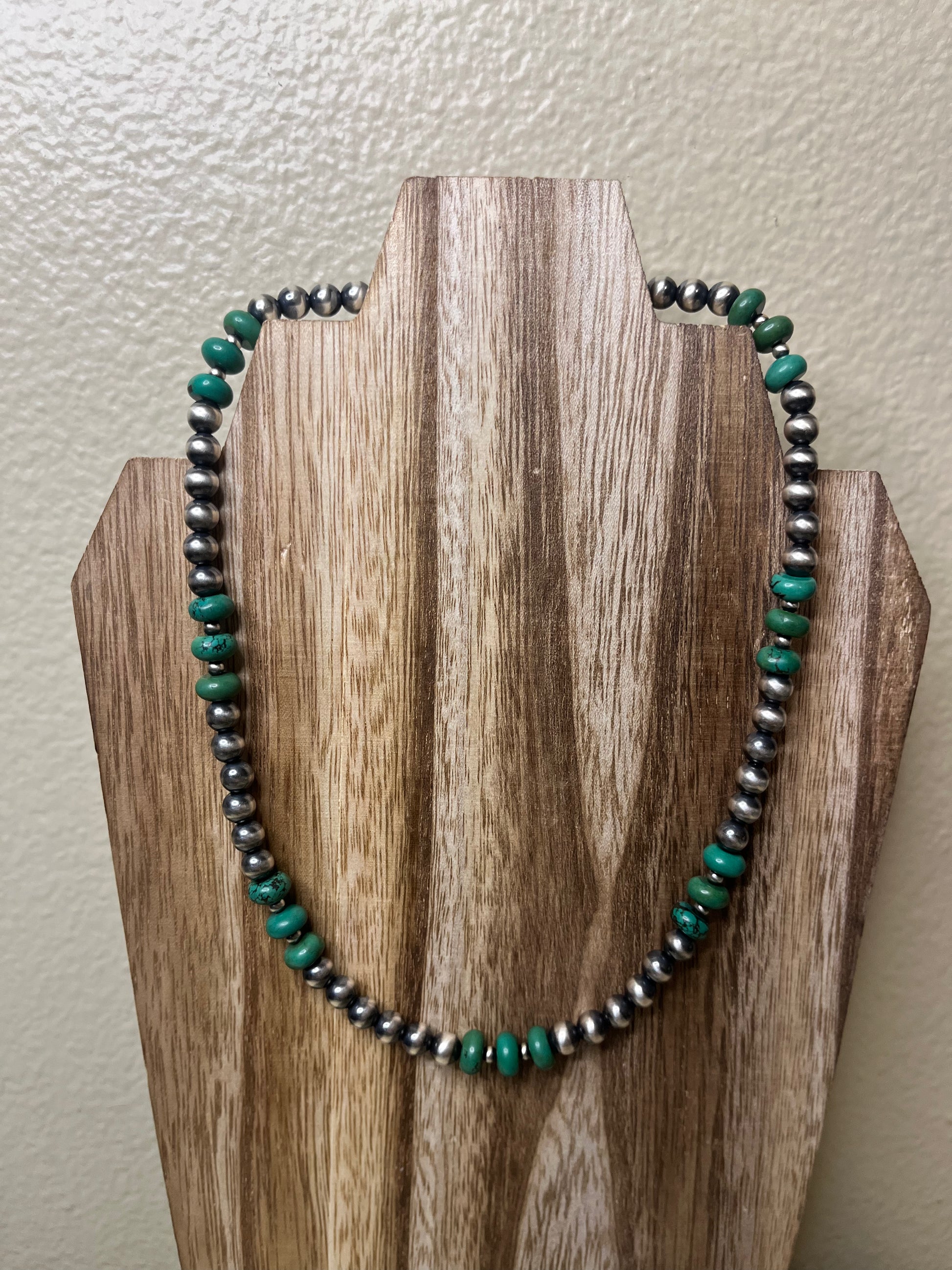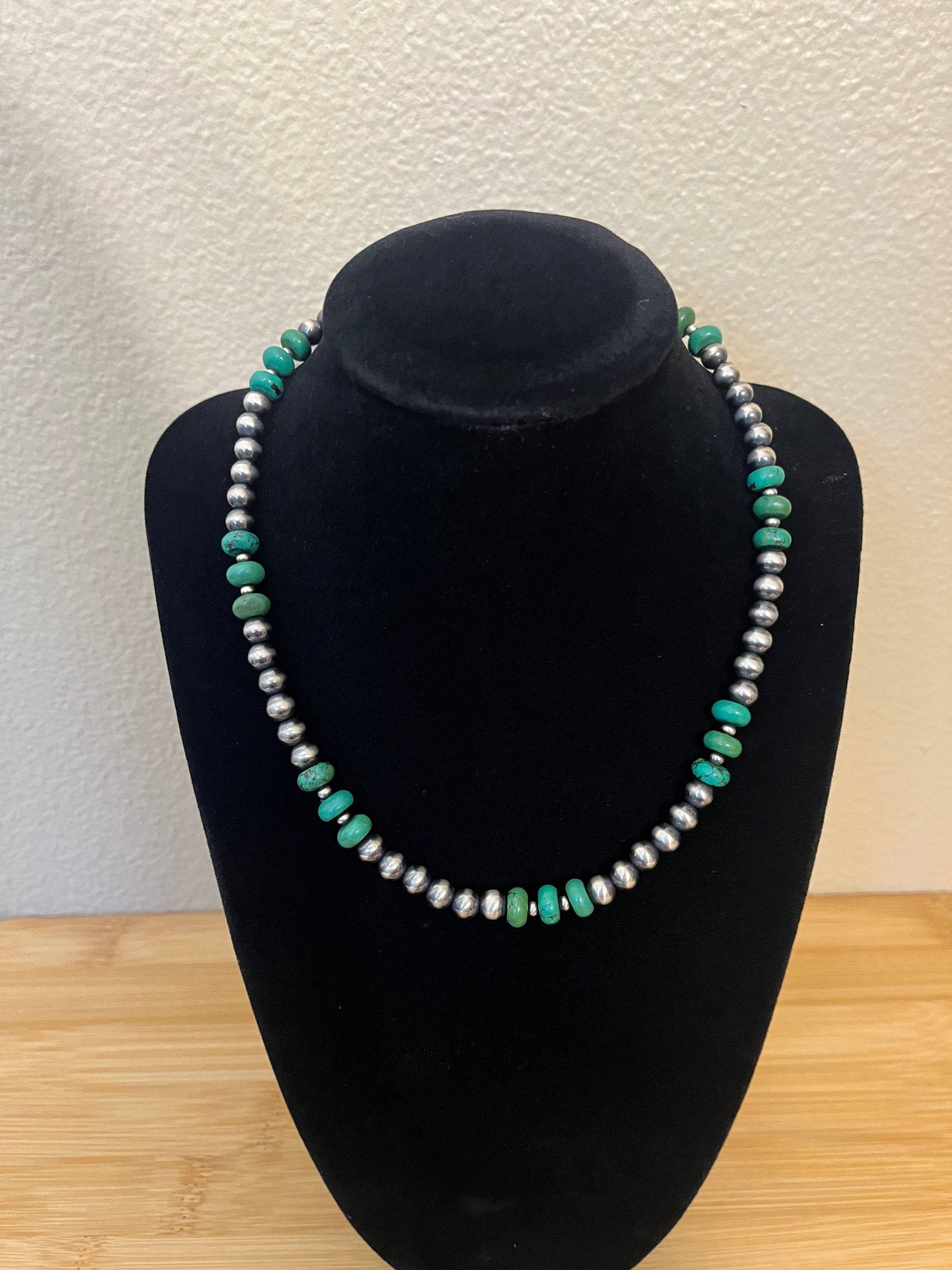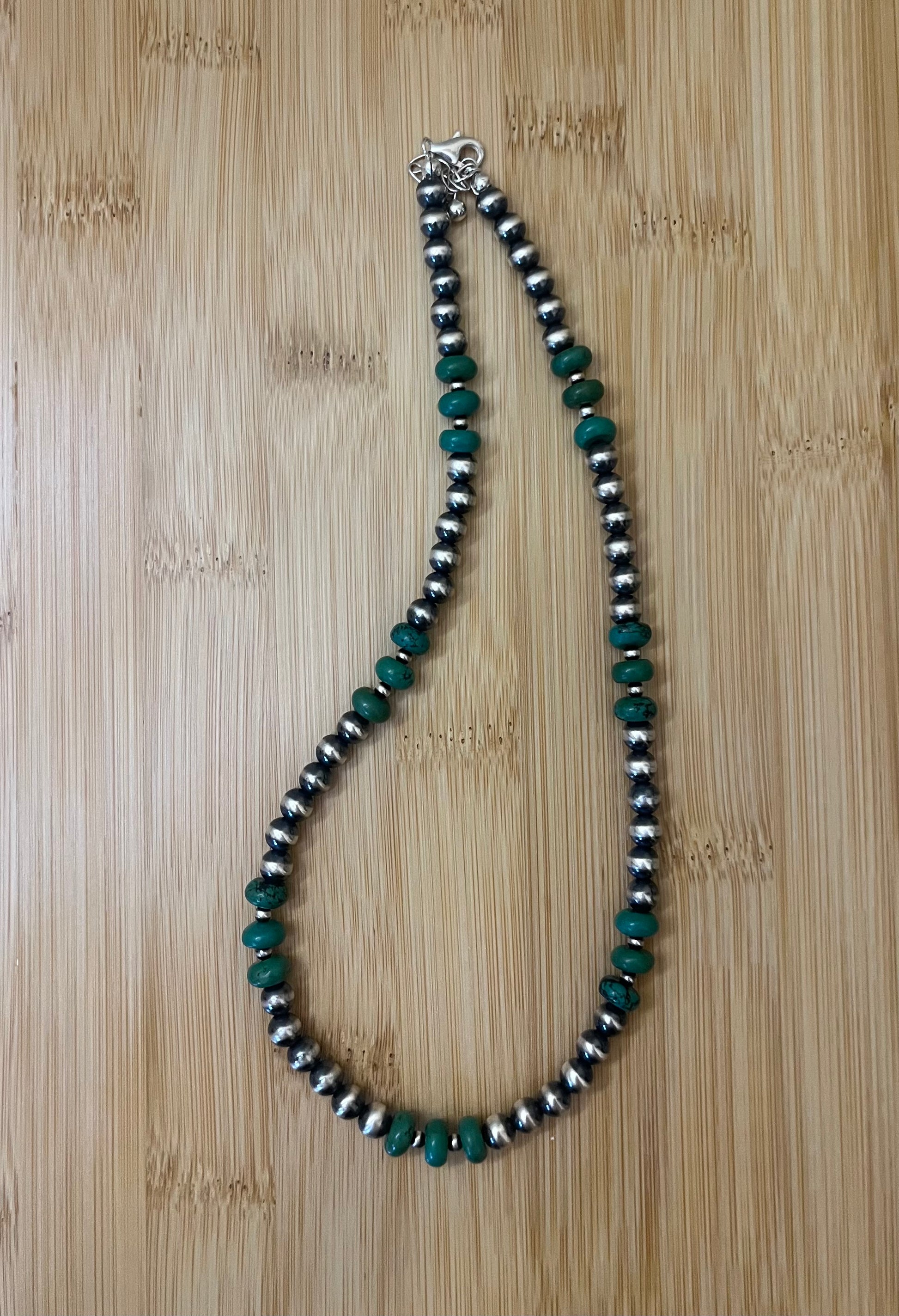 This color is to die for! This necklace is made with 8mm Green Turquoise, 3mm Sterling Silver Navajo Pearls, & 6mm Sterling Silver Navajo Pearls. 16” + 2” extender.