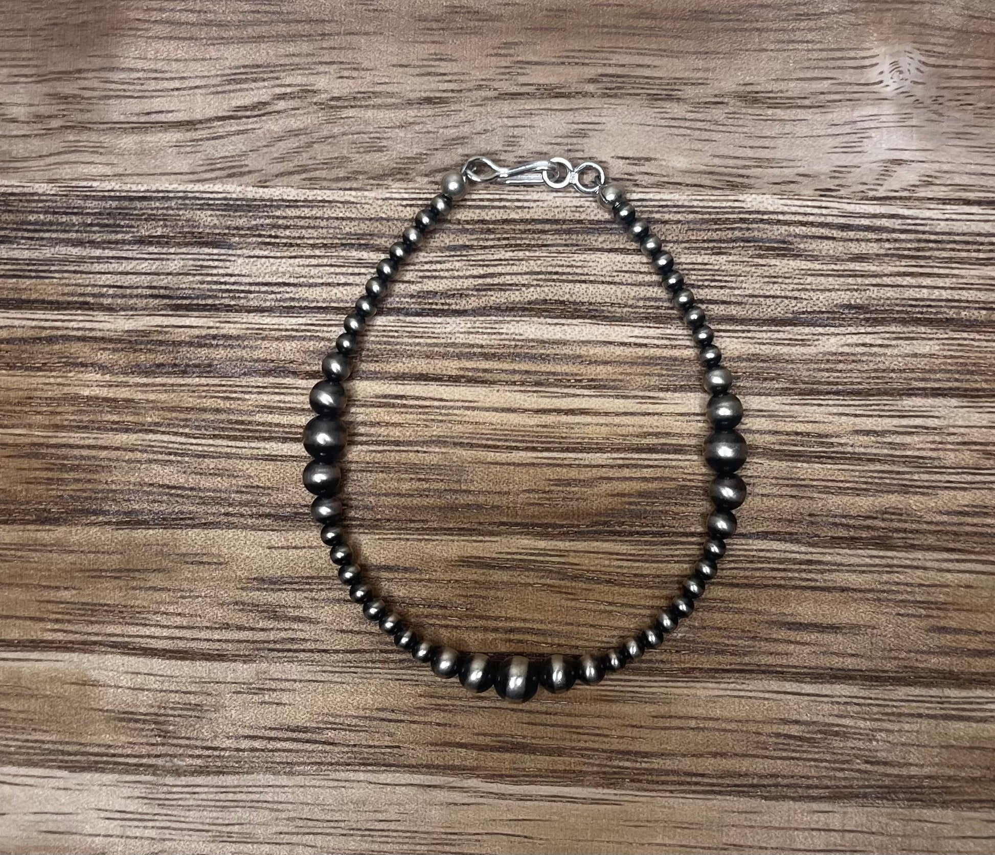 This Delta bracelet is 7.5” long with 3mm, 4mm, 5mm, & 6mm Sterling Silver Navajo Pearls.