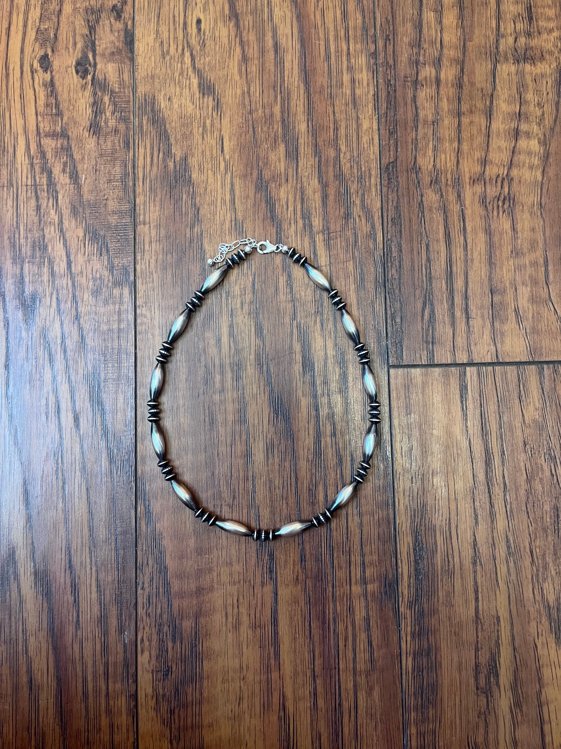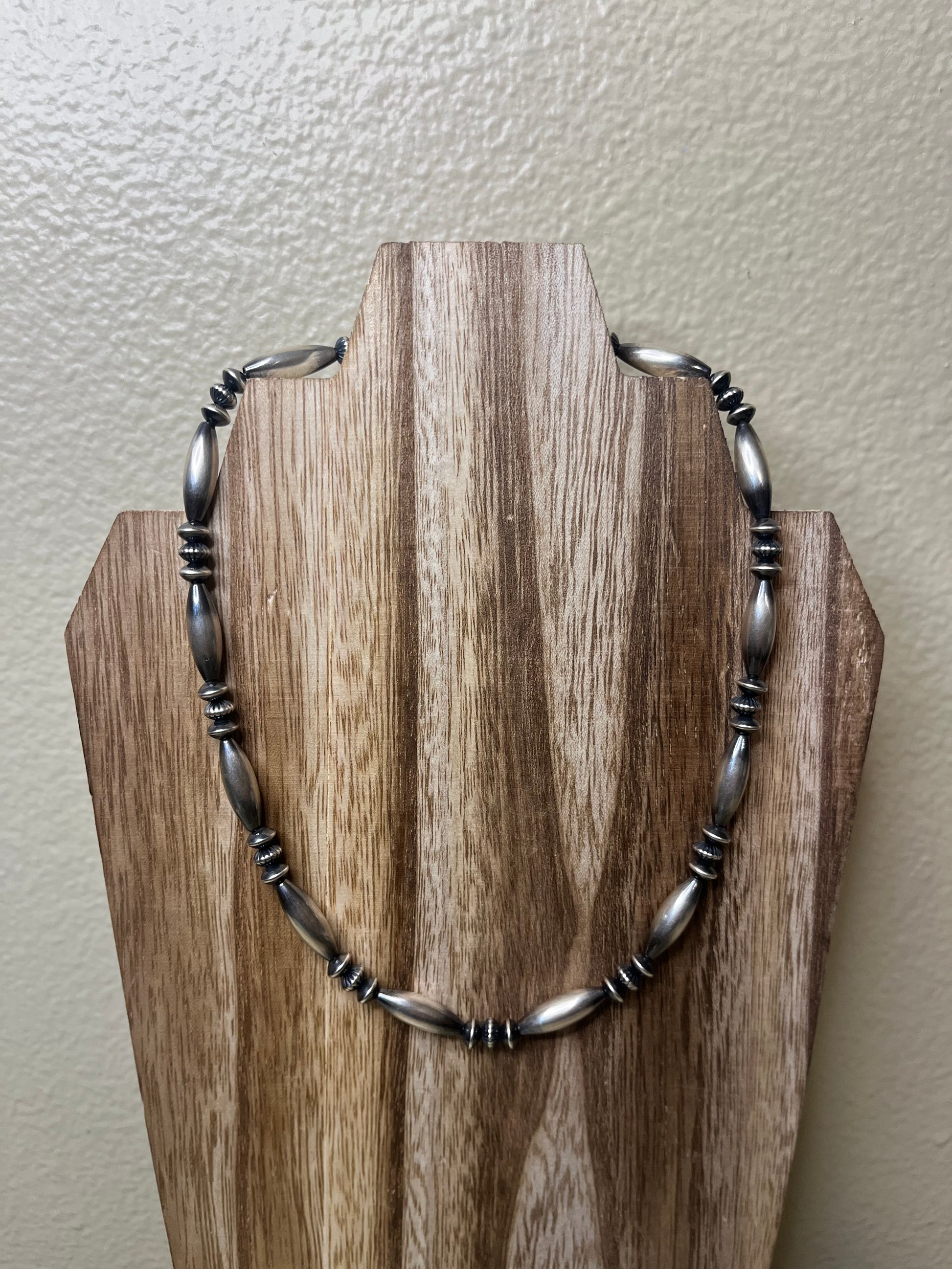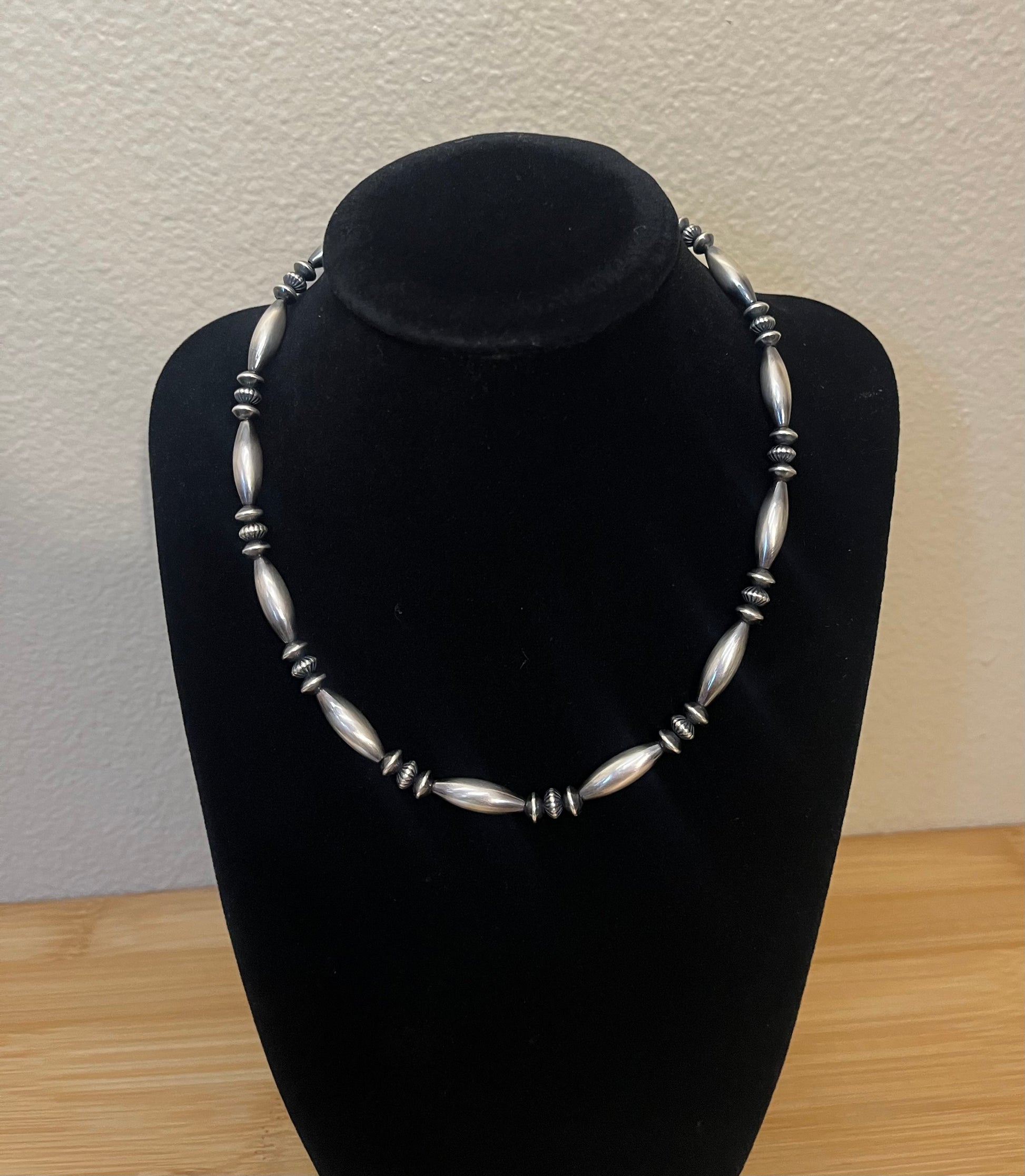 This necklace is perfect! 16” + 2” extender. Made with 6x18mm torpedo, 5.7x3.5 saucer, & 5.7x3.5 textured Sterling Silver Navajo Pearls.