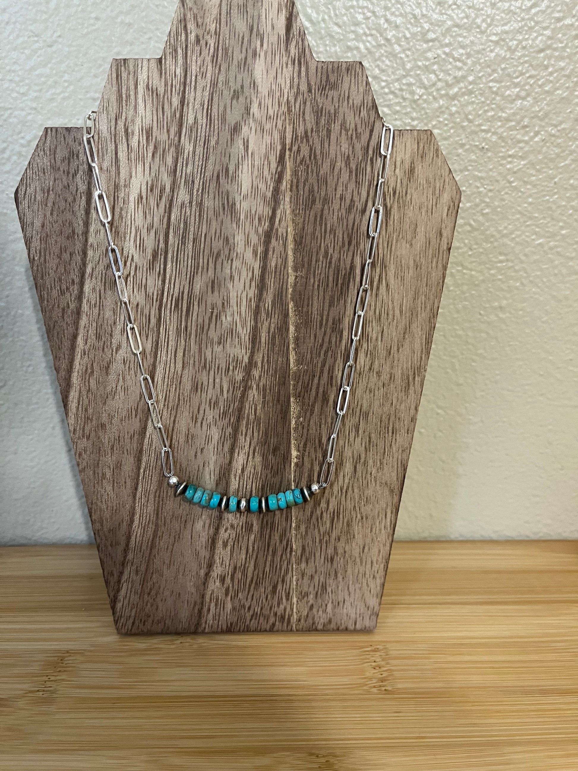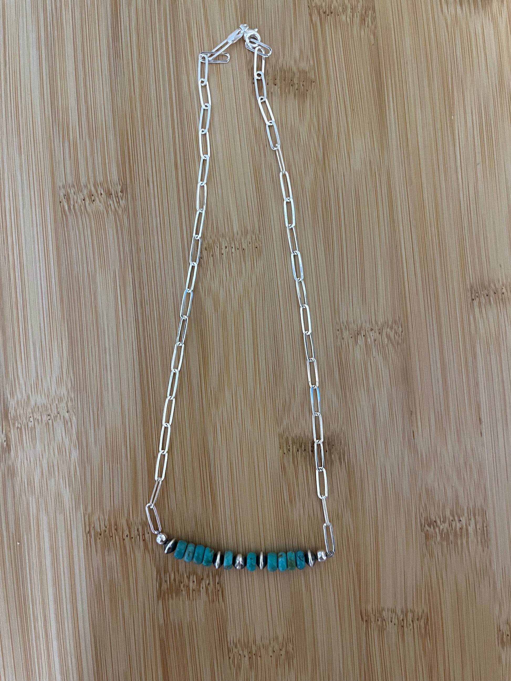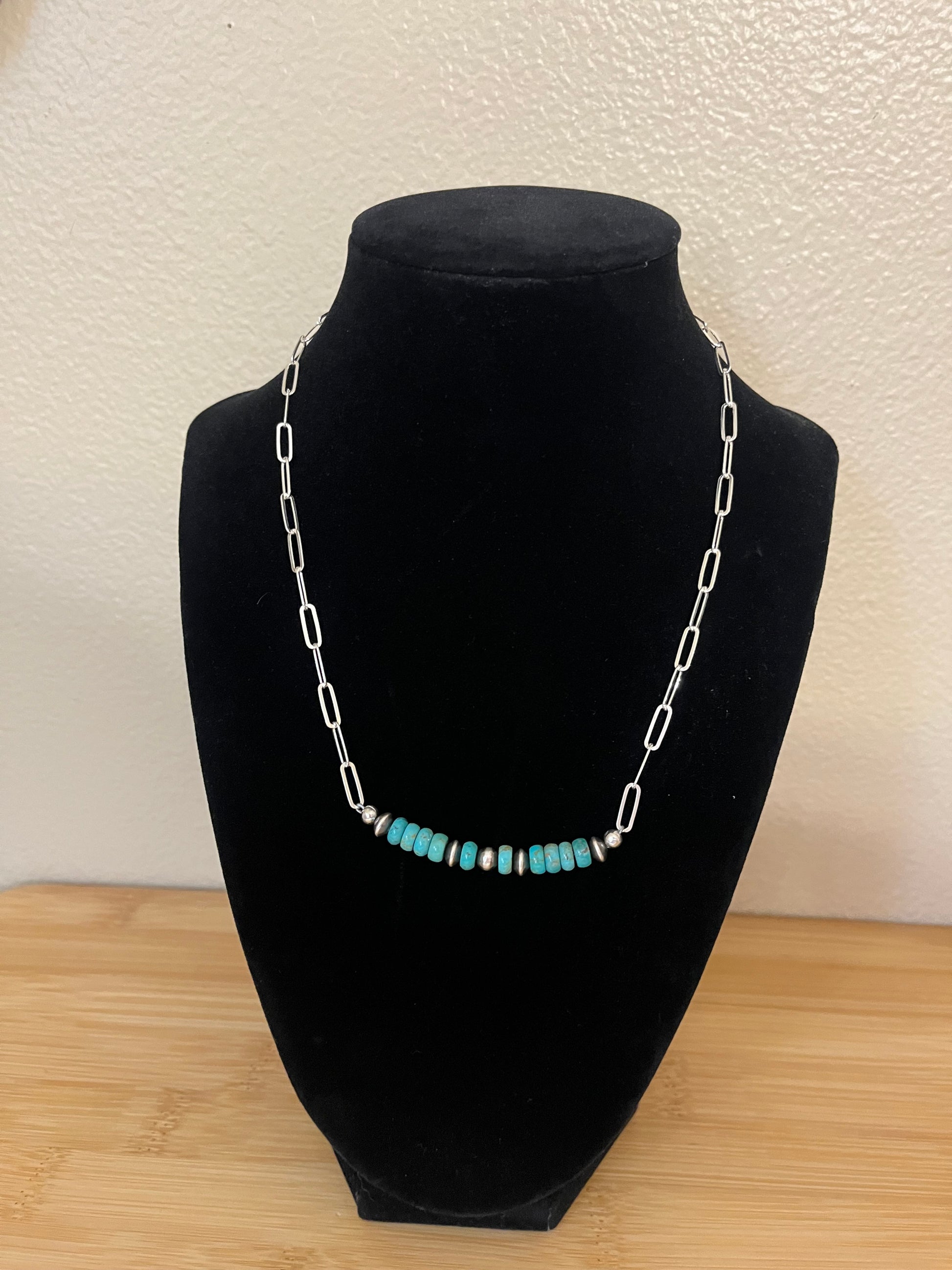 What a unique and cute piece that could go with any look. Made of 16” Paperclip chain, 6mm Turquoise beads and 5mm & 4.5x3.5mm Sterling Silver Navajo Pearls. 16”.
