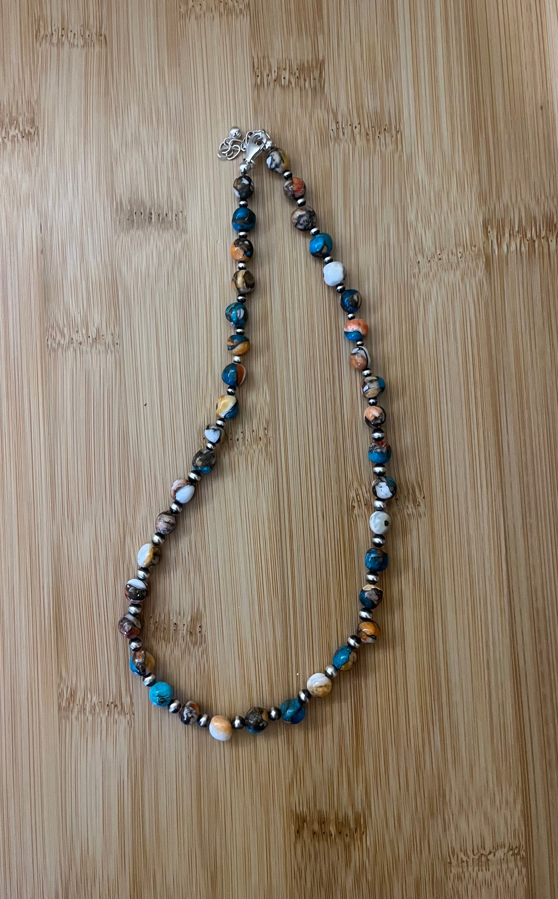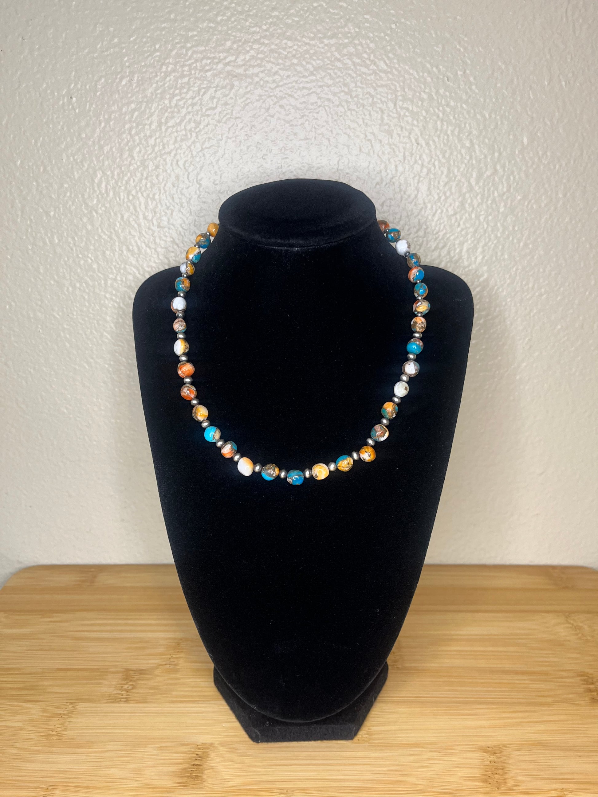 This necklace has the COLOR POP!! Made with 8mm Spiny Oyster beads, 4mm, & 5mm Sterling Silver Navajo Pearls. 16” + 2” extender.