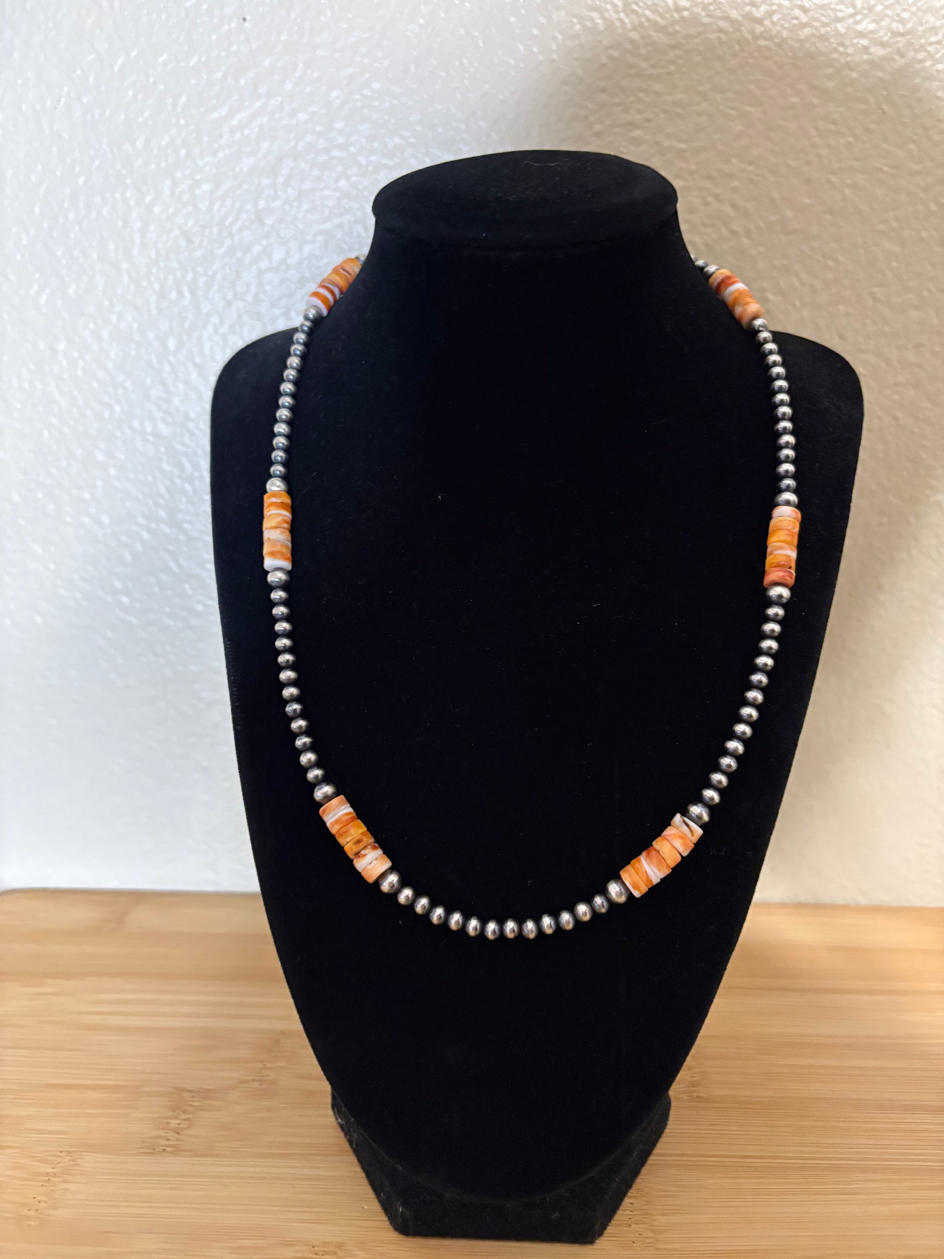 Look at that bright and vibrant orange! This stunning piece is made of 4mm & 5mm Sterling Silver Navajo Pearls & 6mm Spiny Oyster beads. 20” + 2” extender.