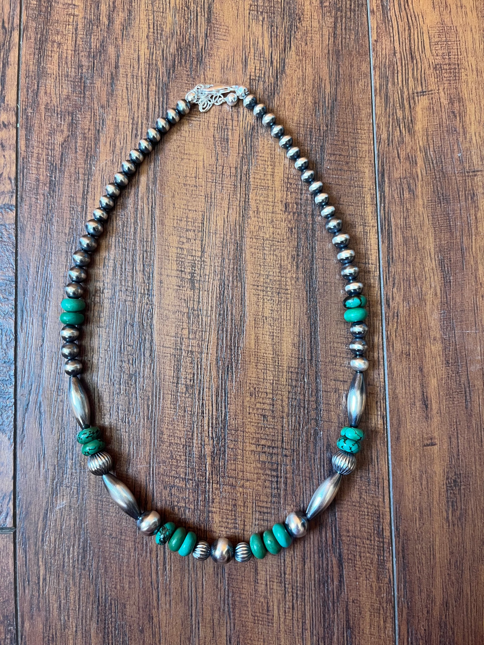 This is a piece you won’t find anywhere else! The perfect mix of Navajo and Green Turquoise. This necklace has 5mm, 6mm, 8mm Sterling Silver Navajo Pearls. With 6x18mm Torpedo Navajo and 8mm Green Turquoise beads. 16” + 2” extender.