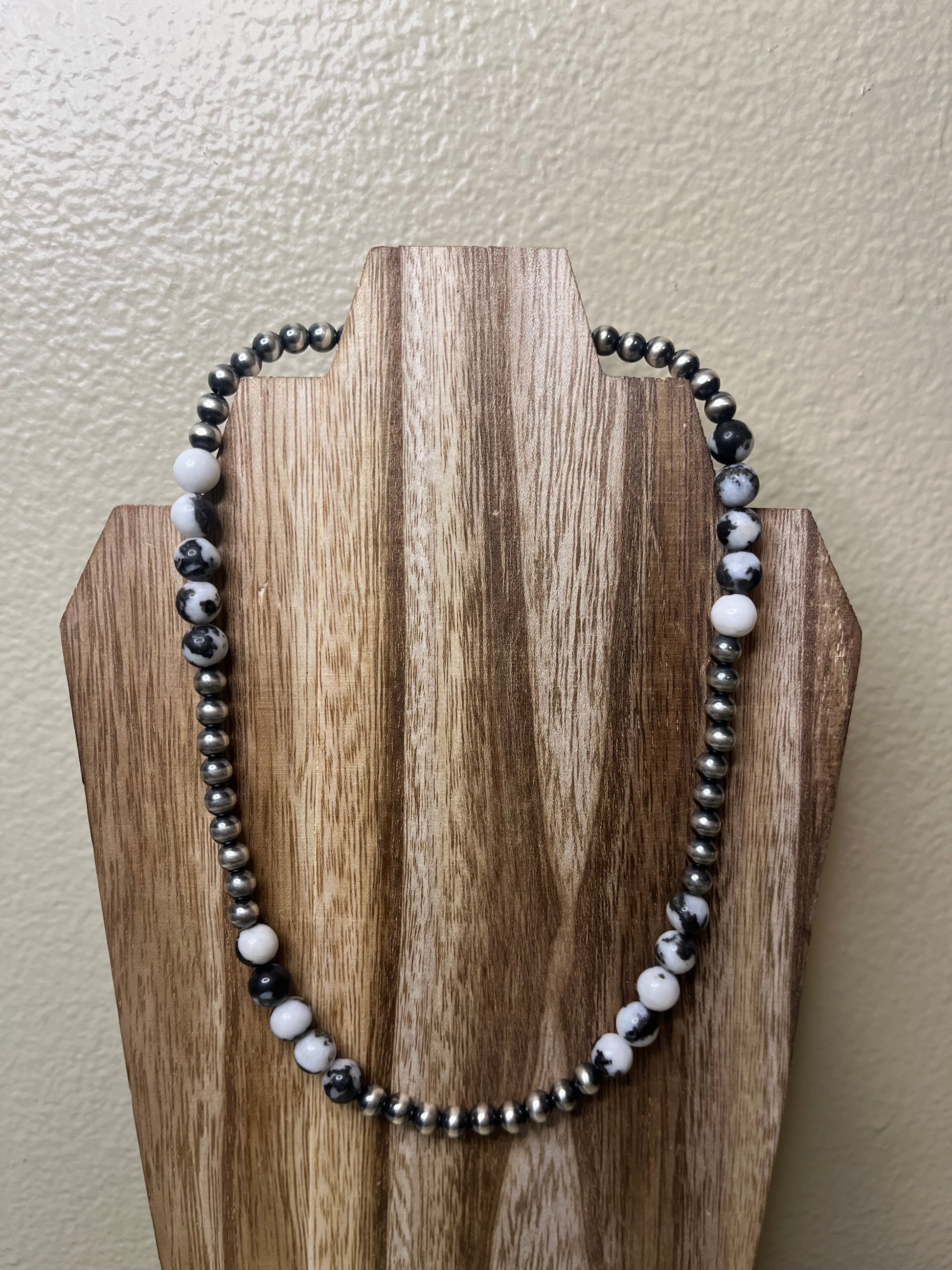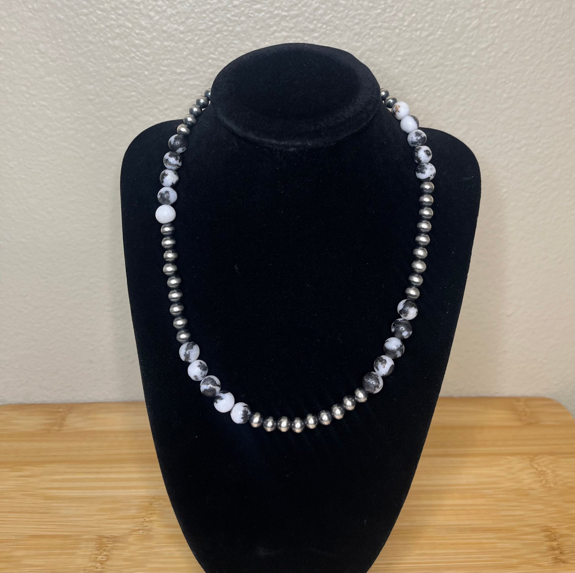 This necklace is so perfect! This necklace is perfectly made with 6mm Sterling Silver Navajo Pearls with 8mm Zebra Jasper. 18” + 2” extender.