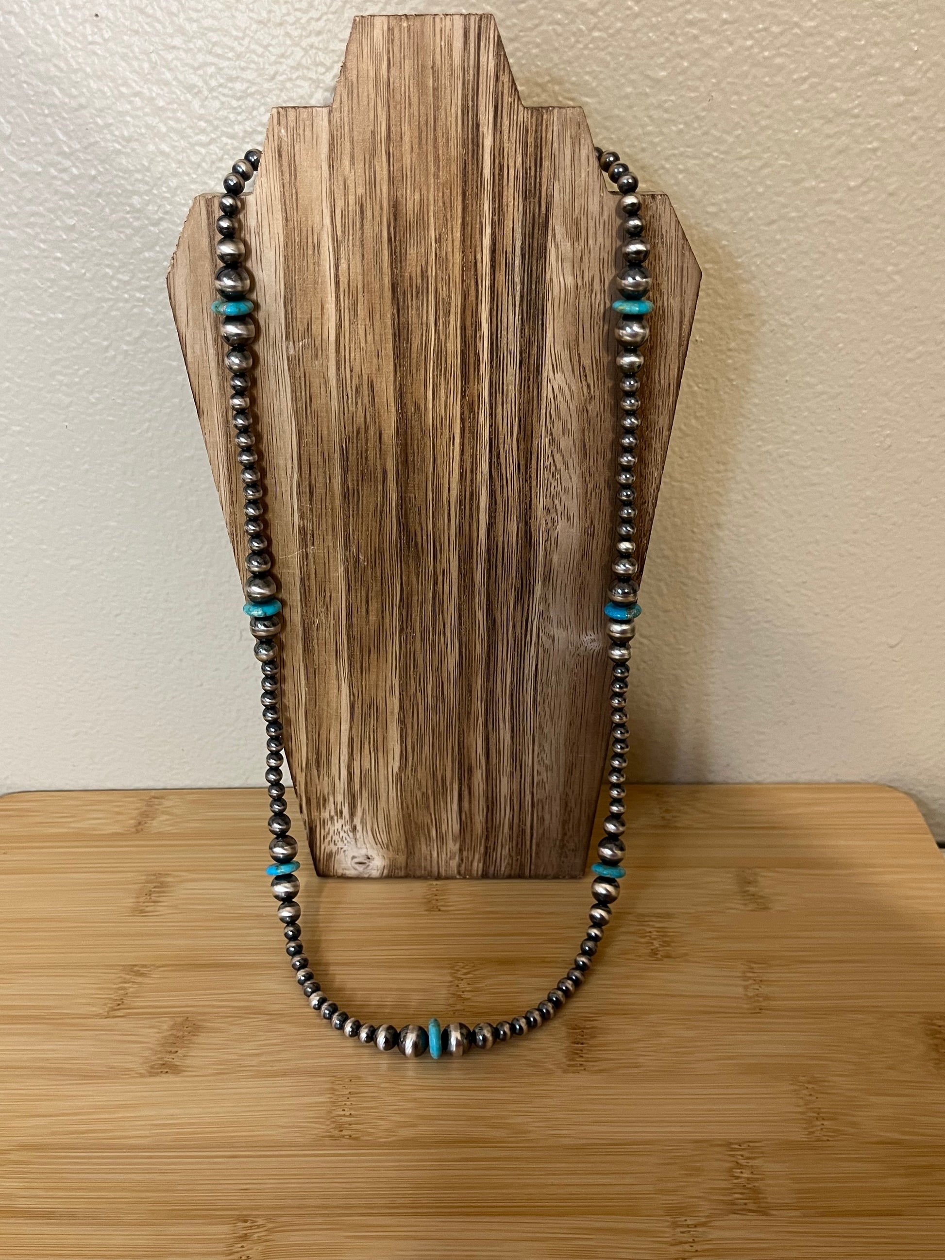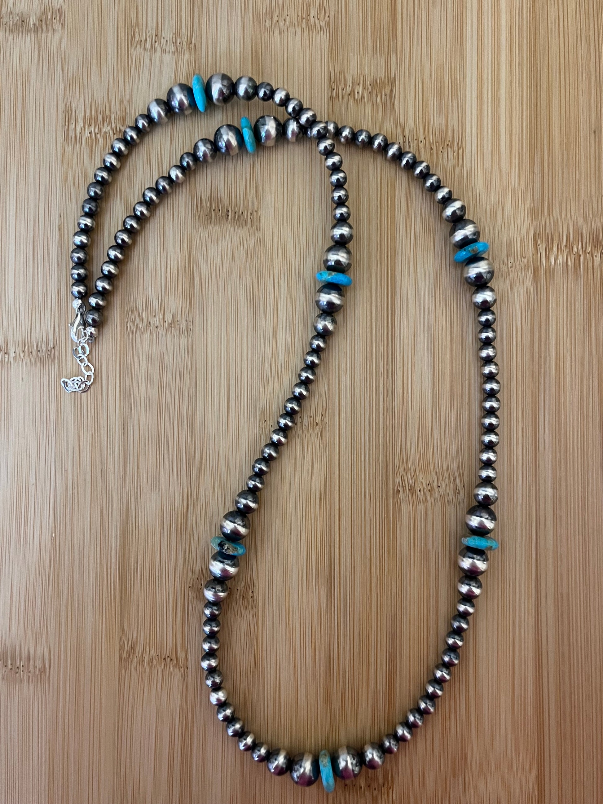 This necklace is so beautiful. This has a 30” + 2” extender length and is made of 6mm, 8mm, & 10mm Sterling Silver Navajo Pearls & 12mm Kingman Turquoise wafer beads.