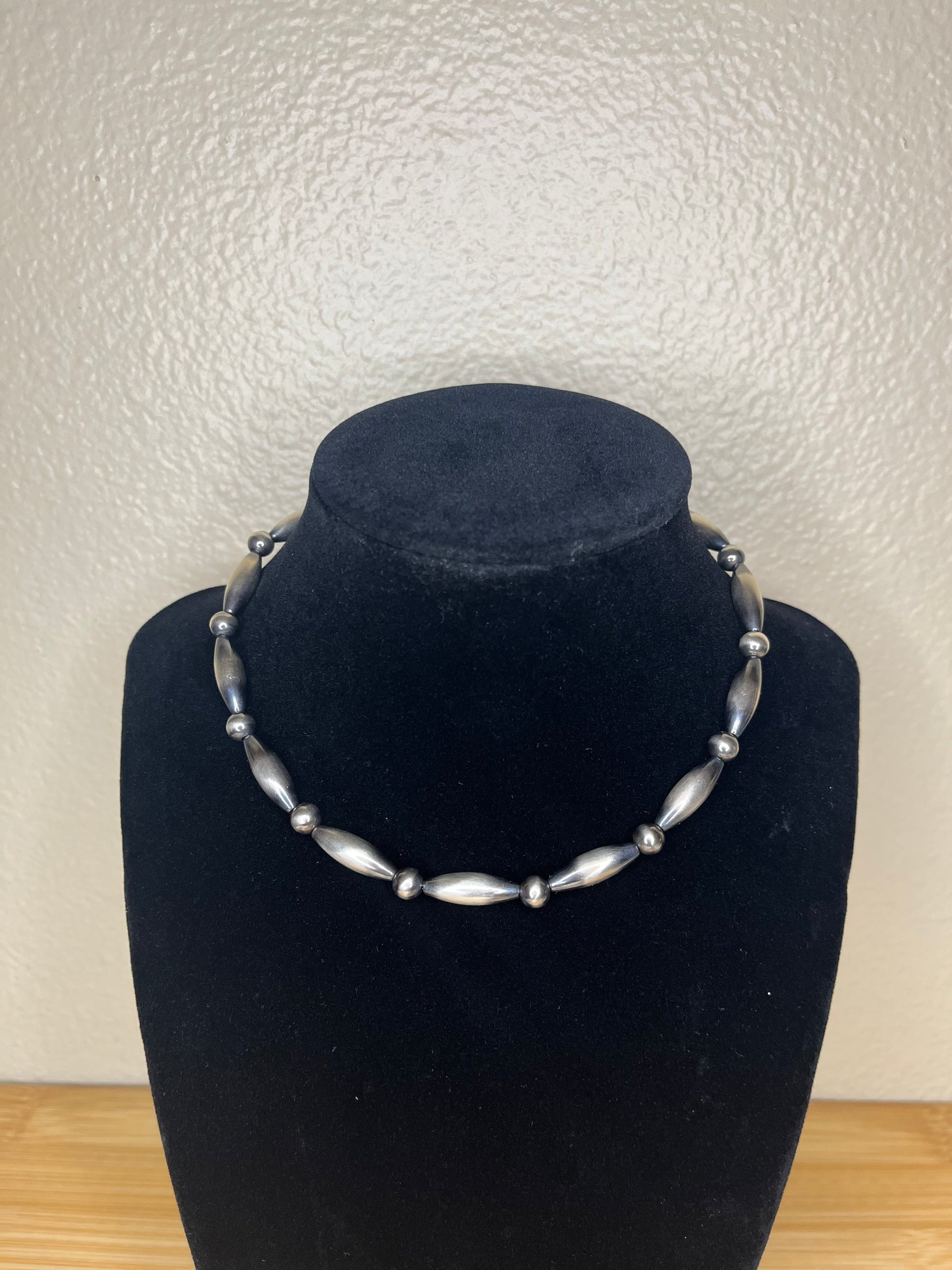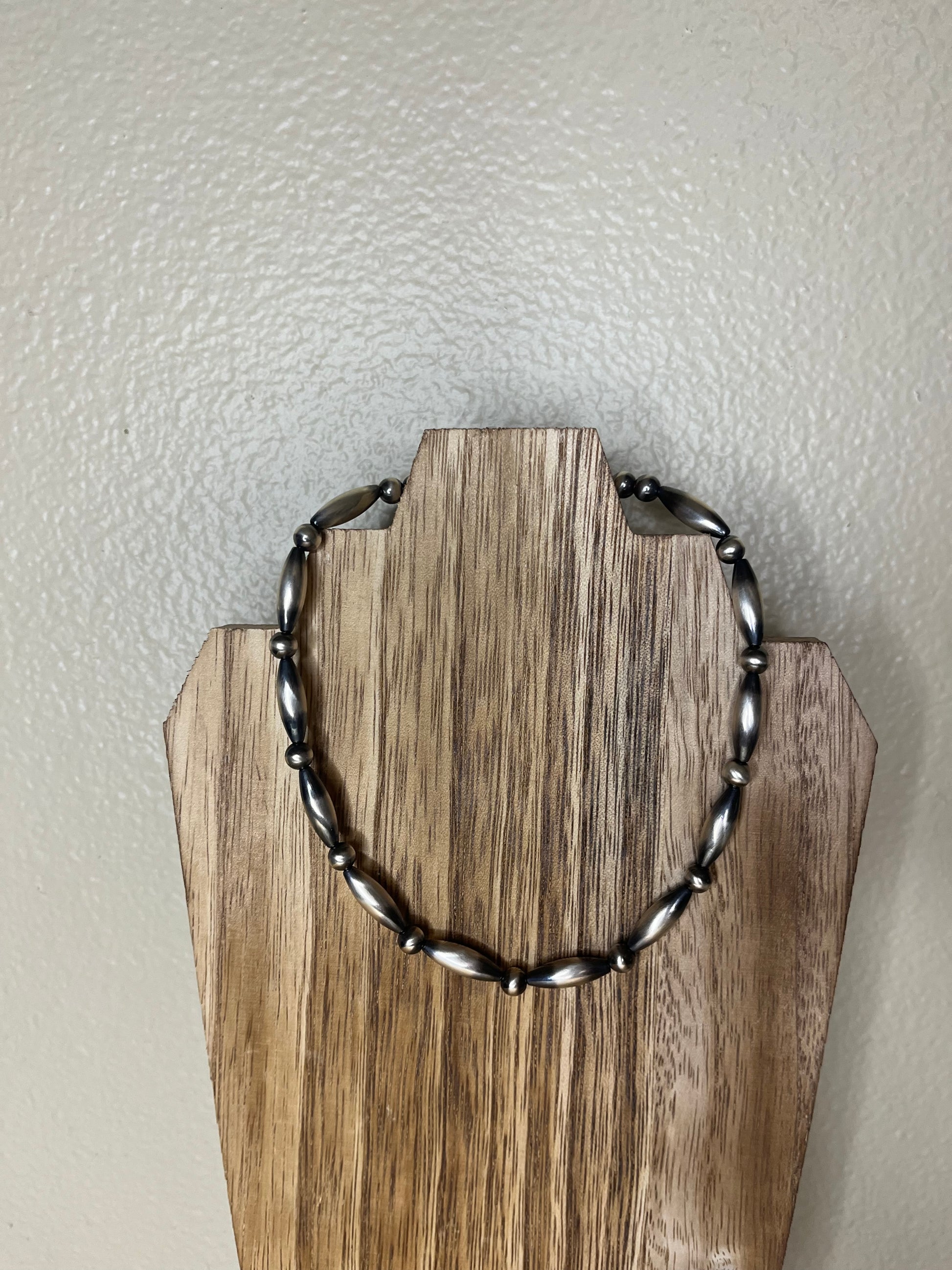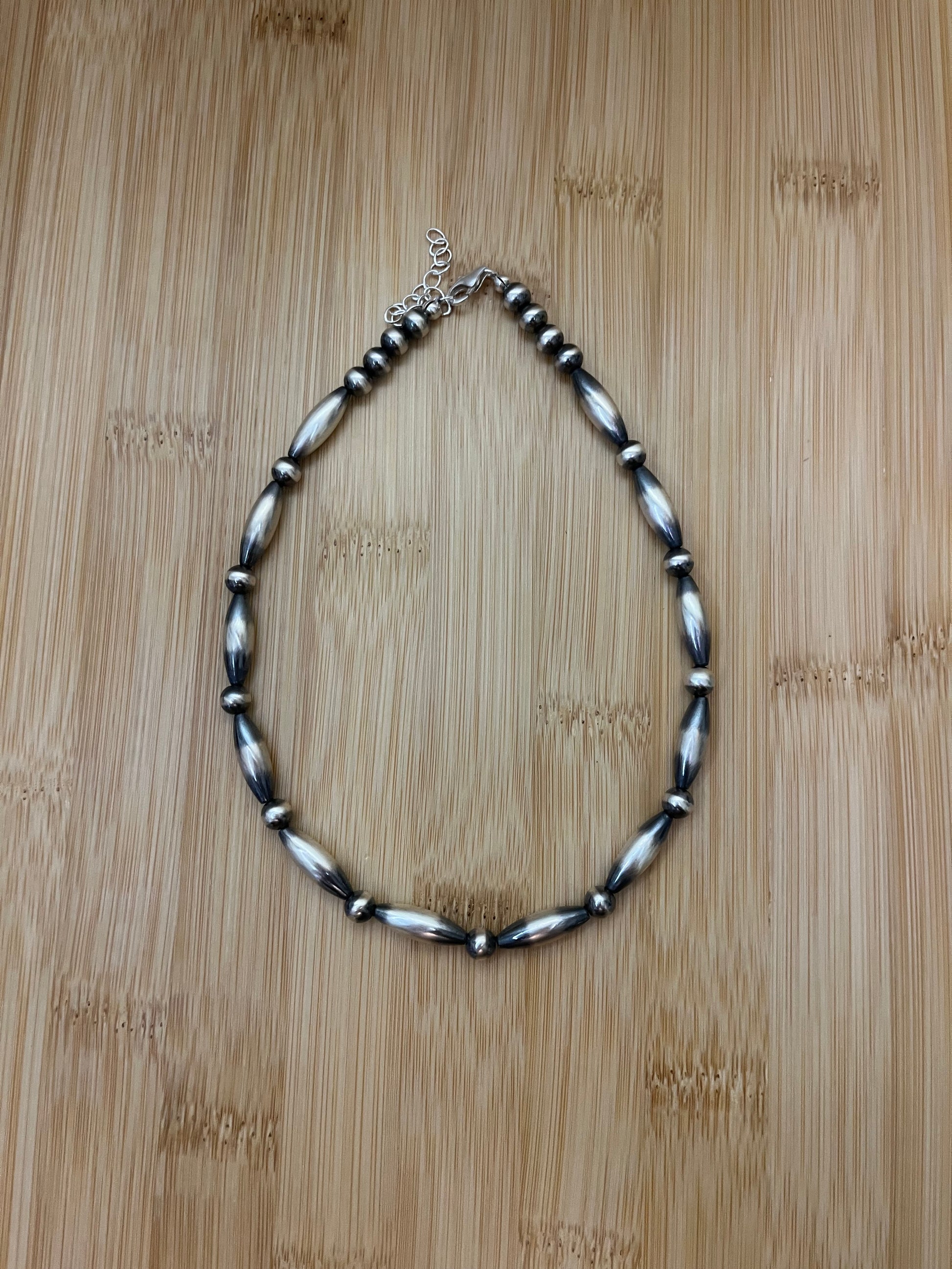 The design on this necklace is so much fun! Made with 6mm Sterling Silver Navajo Pearls and 6x18mm torpedo Sterling Silver Navajo Pearls. 14” + 2” extender.