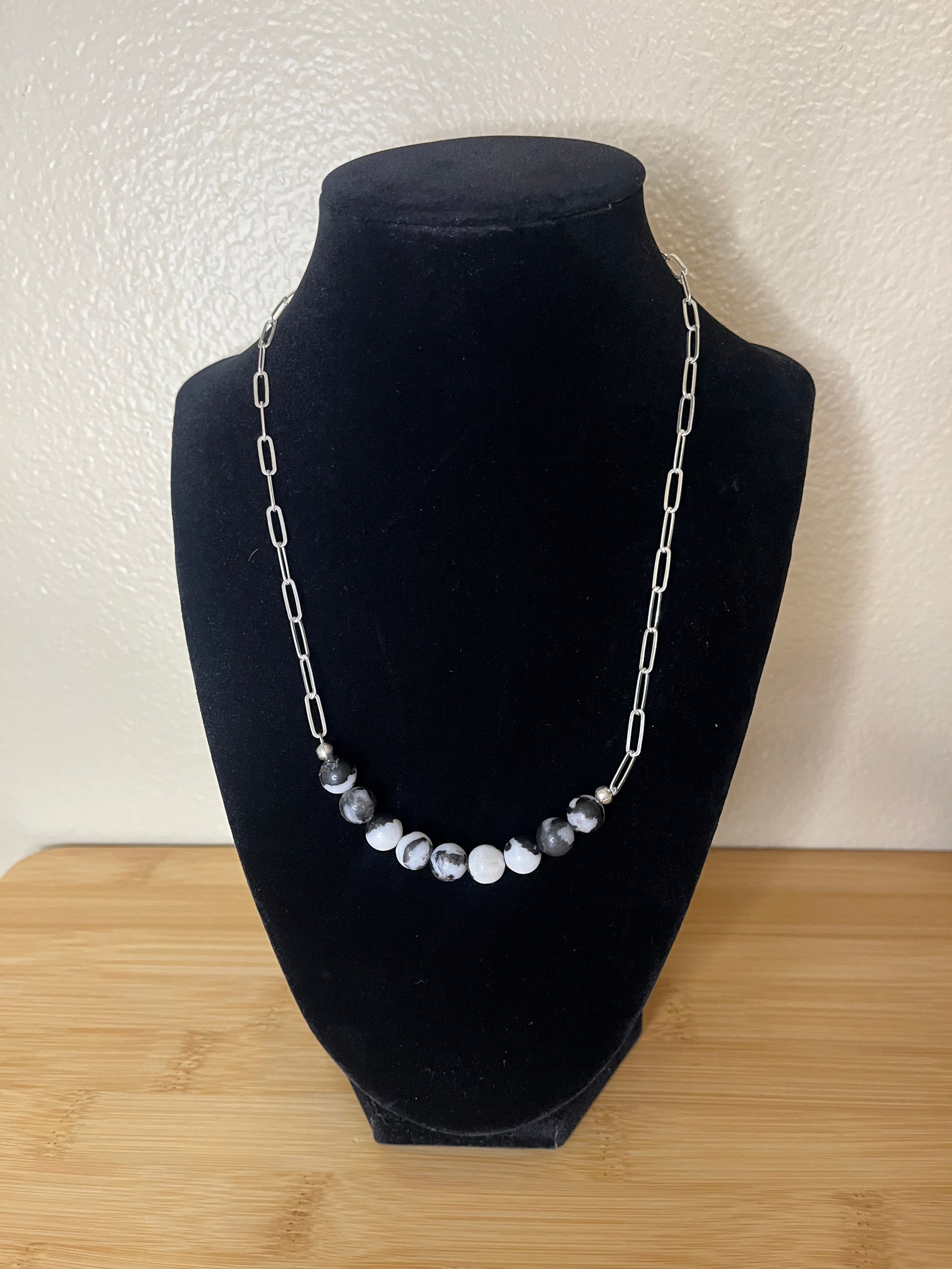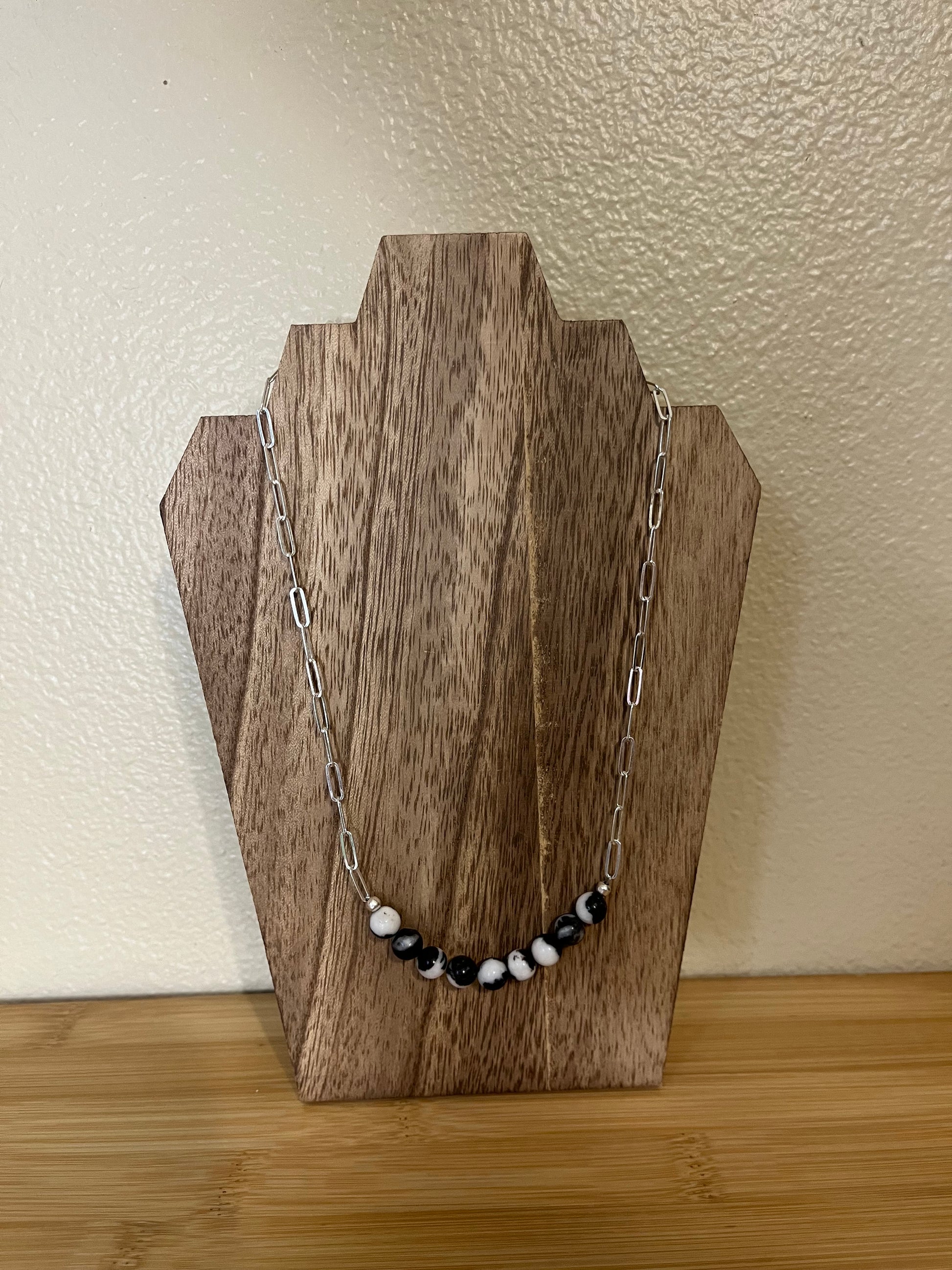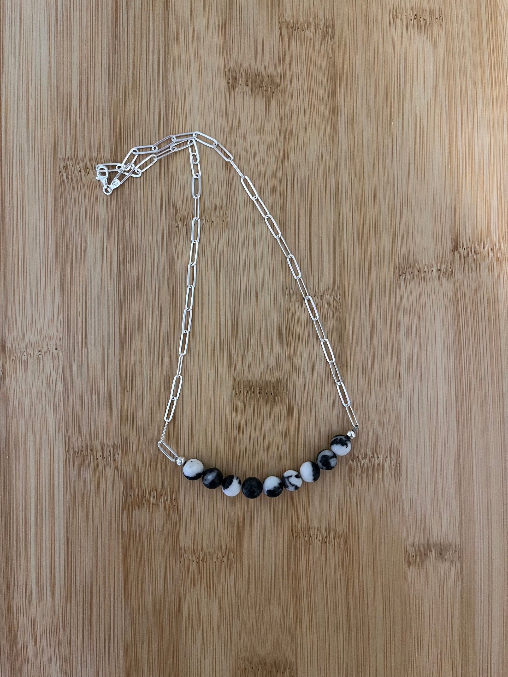 This adorable Paperclip chain & bar necklace is so cute! Made of Sterling Silver Paperclip chain & 8mm Zebra Jasper. 16”.