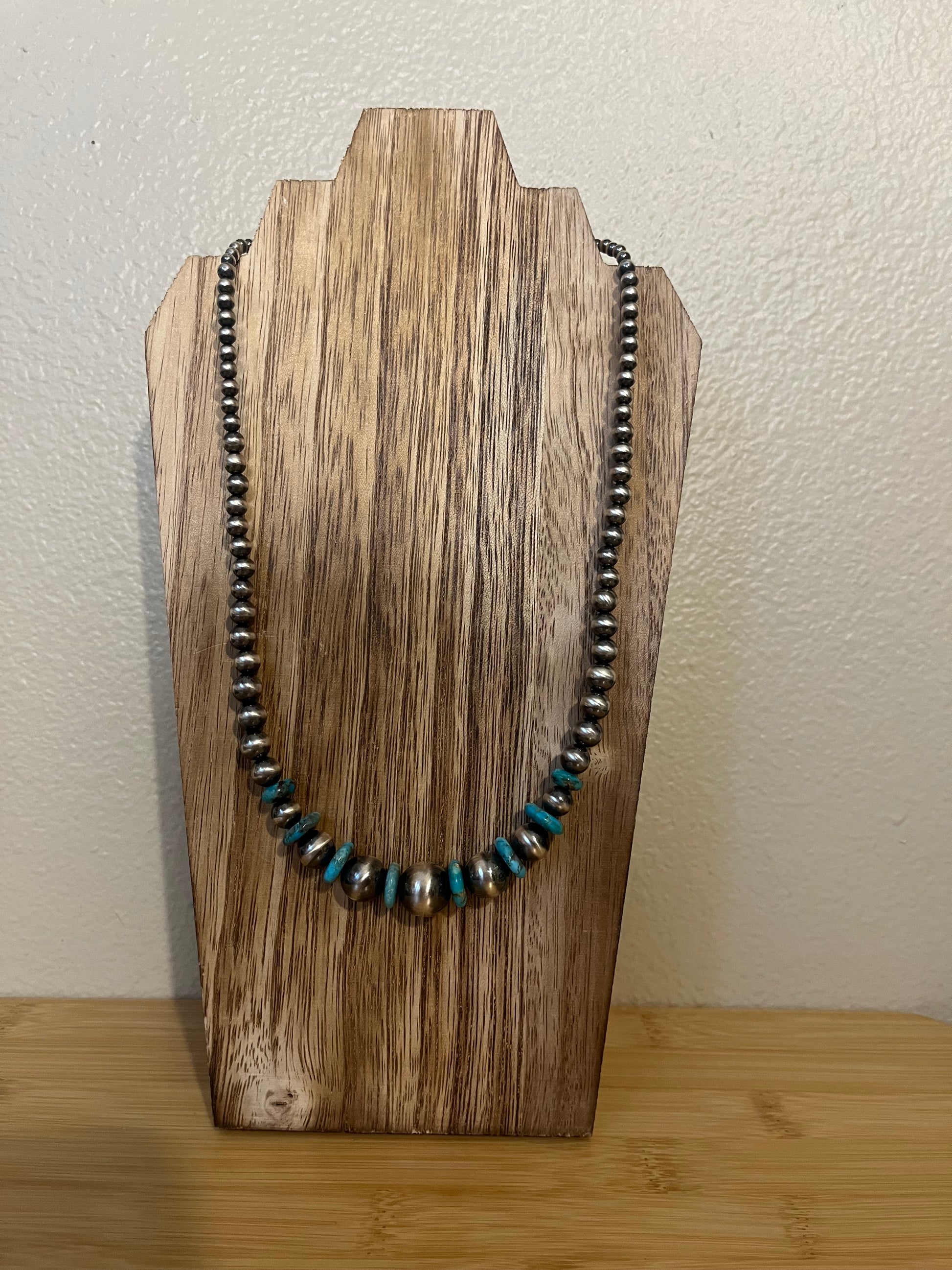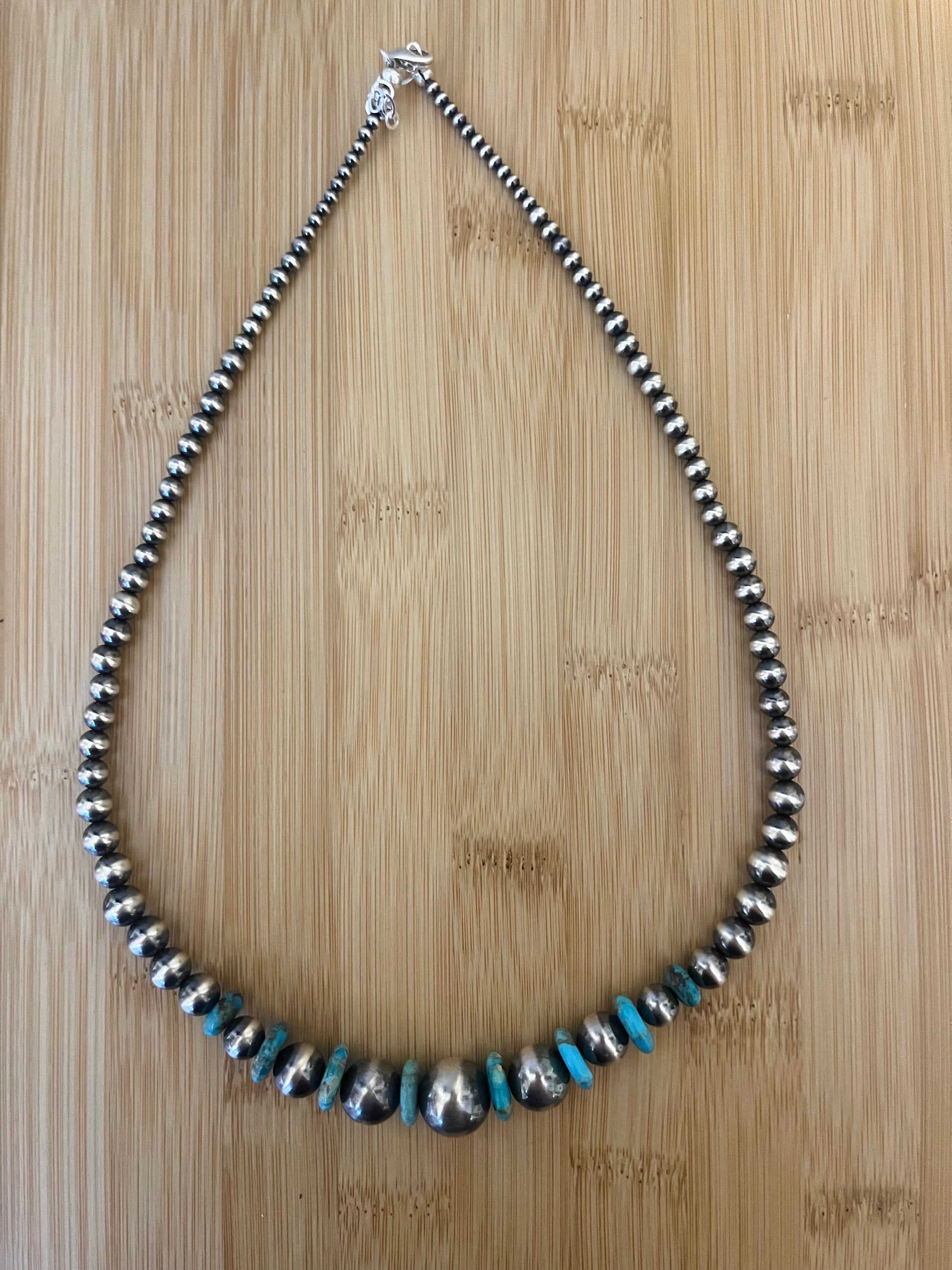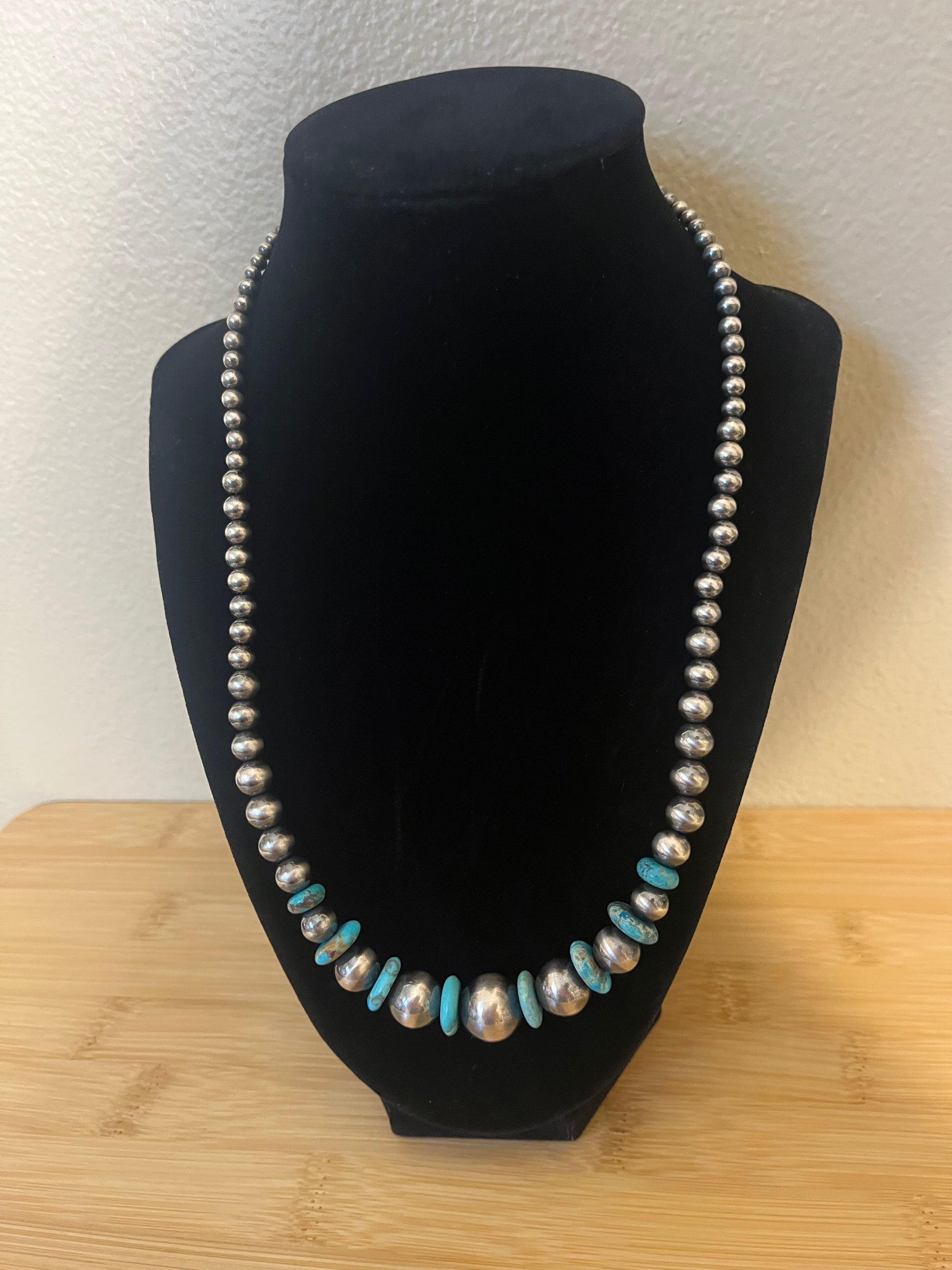 This necklace is nothing but gorgeous!! This beauty is made of 13mm & 10mm Kingsman Turquoise with 14mm, 12mm, 10mm, 8mm, 7mm, 6mm, 5mm, 4mm, & 3mm Sterling Silver Navajo Pearls. 20” + 2” extender.