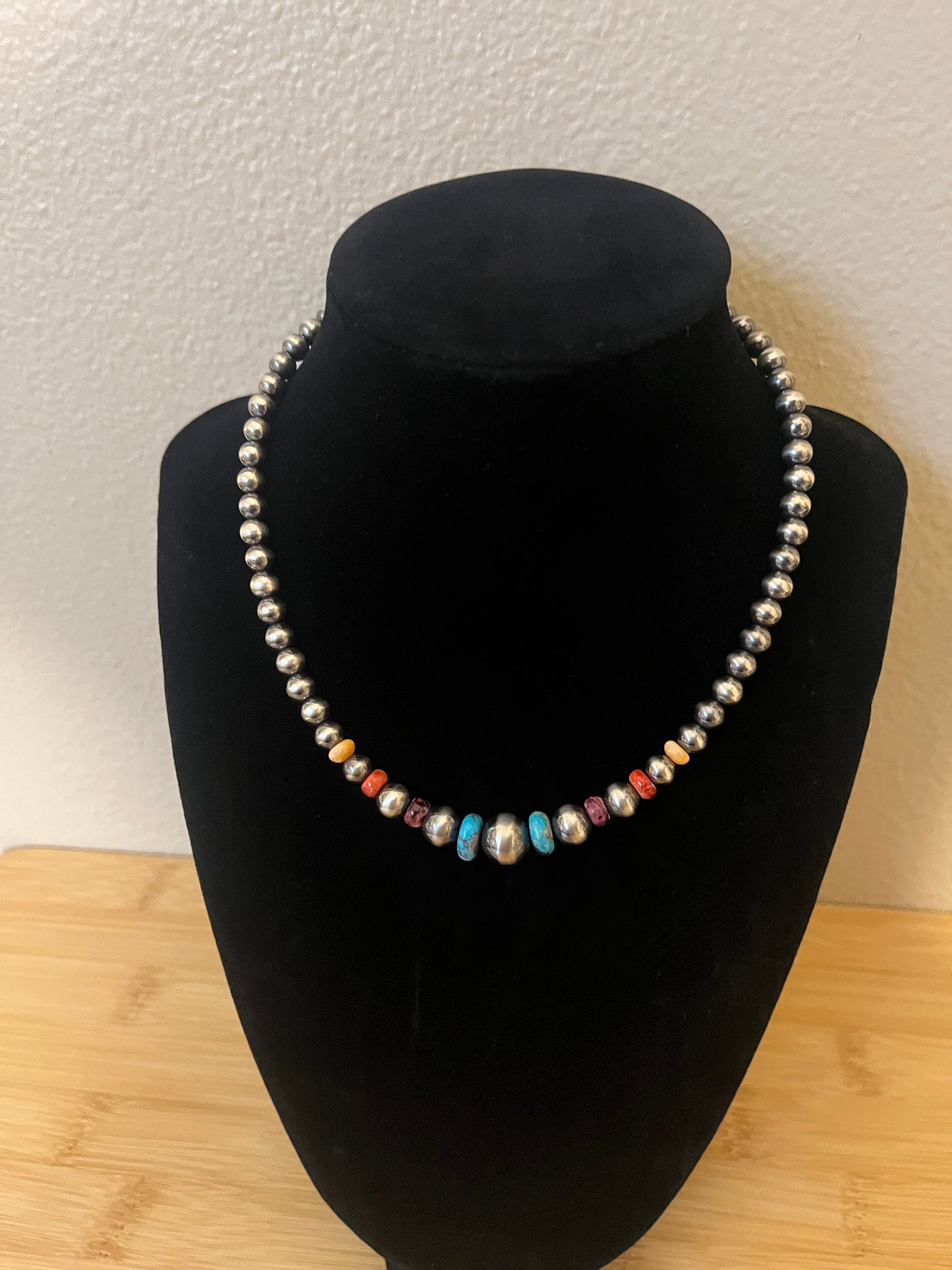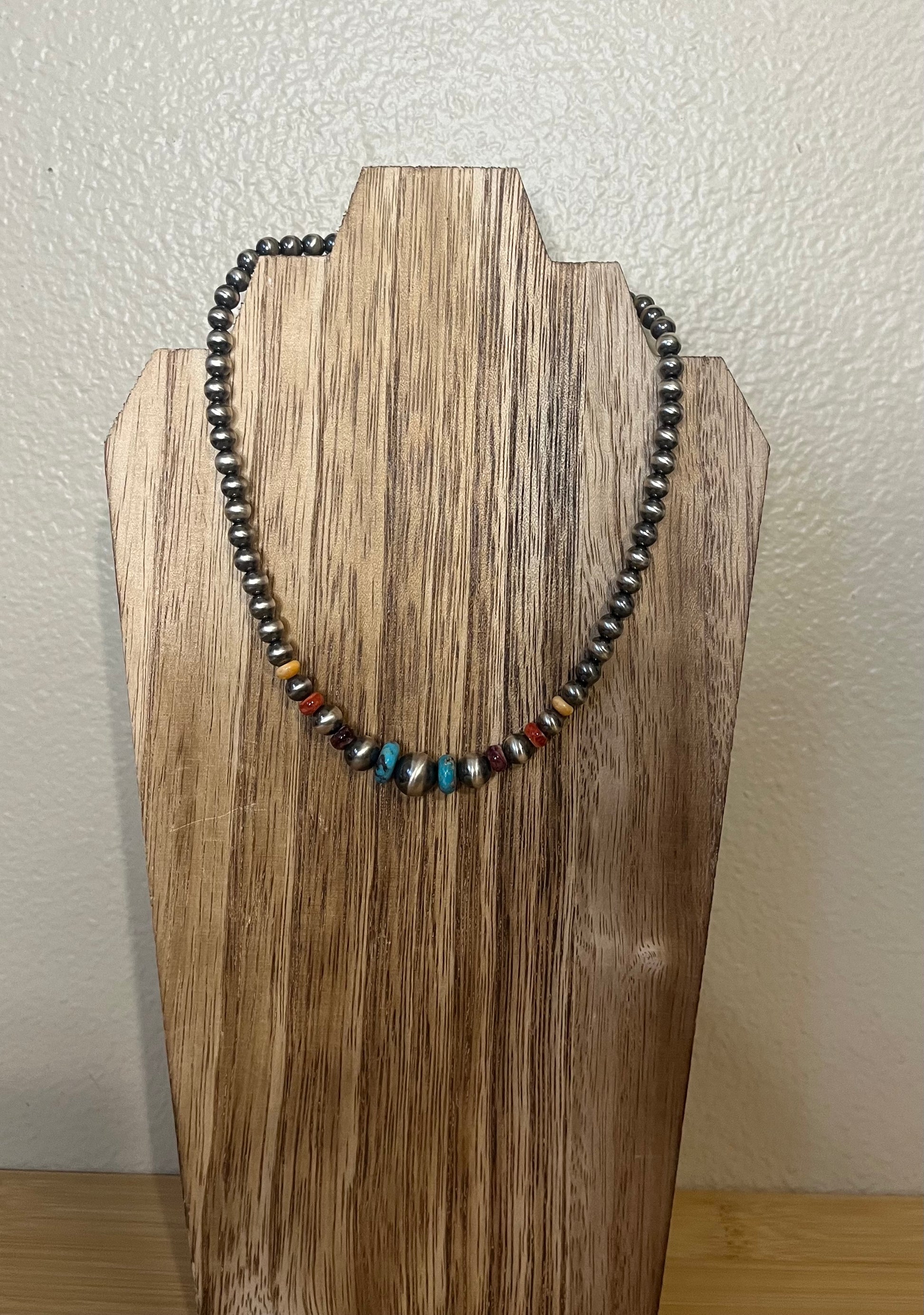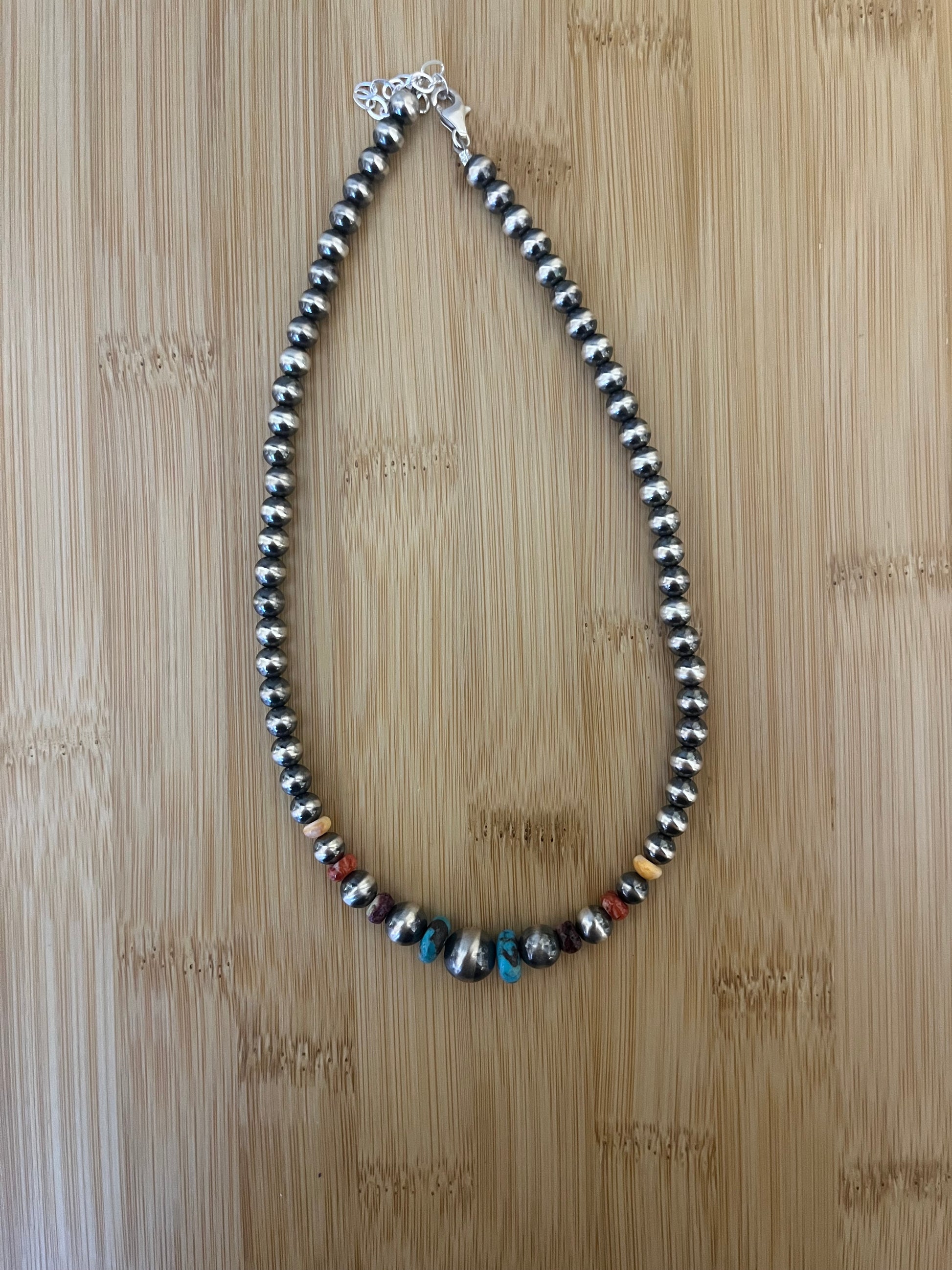 Who doesn’t love some color!! This summer color necklace is made of 6mm Coral, 6mm Red Spiny Oyster, 6mm Purple Spiny Oyster, and 10mm Kingsman Turquoise with 10mm, 8mm, 7mm, & 6mm Sterling Silver Navajo Pearls. 16”+ 2” extender.
