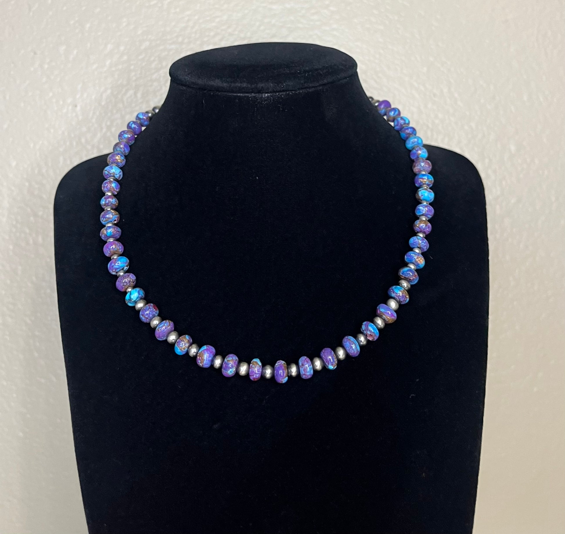 This stunning necklace is made with 6mm Spotted Mohave & 3mm, 4mm, & 5mm Sterling Silver Navajo Pearls. 16” + 2” extender.