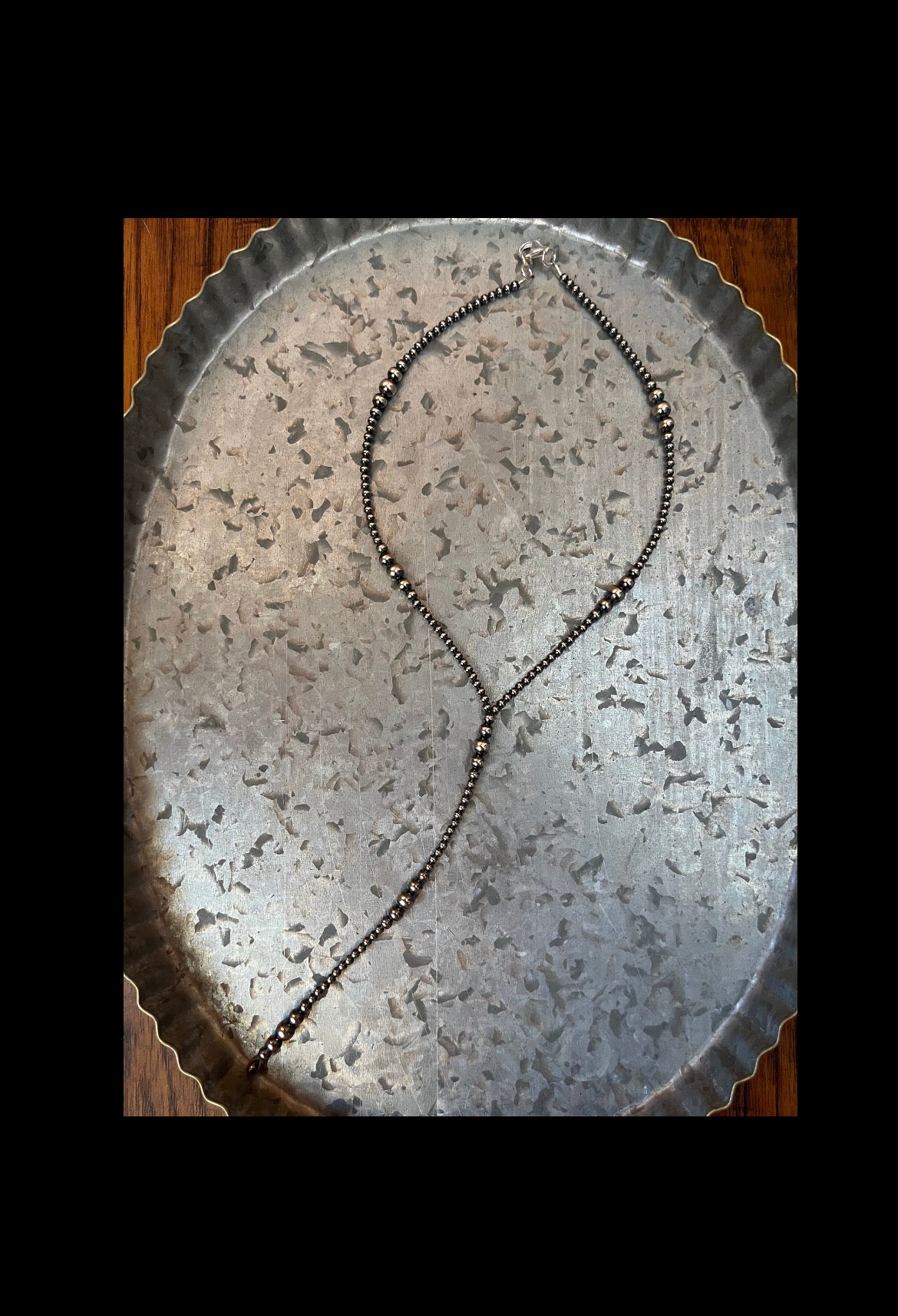 This necklace is definitely different, but makes everything more fun! tapered with 6mm, 5mm, 4mm, & 3mm Sterling Silver Navajo Pearls. 16” long.