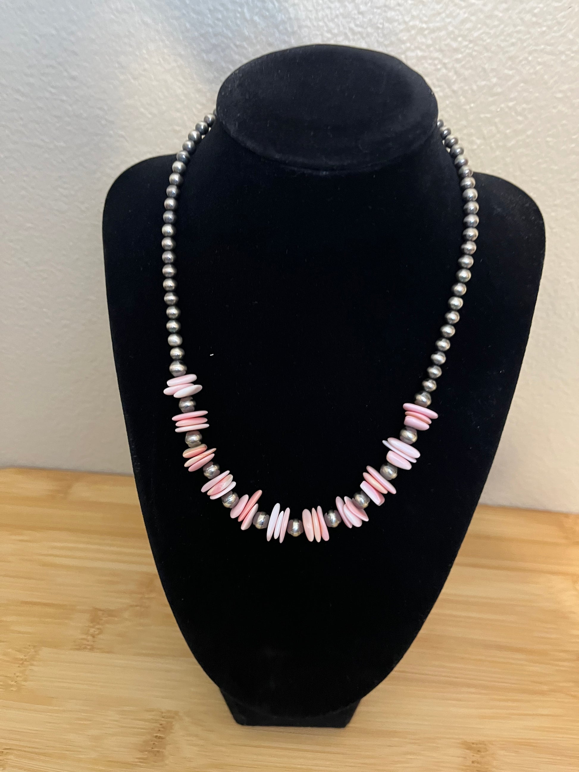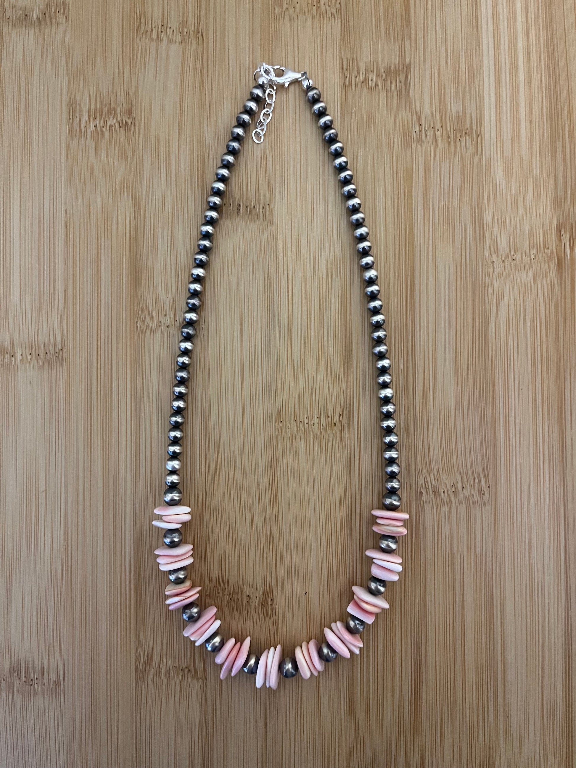 This necklace is so cute and unique! Made with large Pink Conch Chips & Sterling Silver Navajo Pearls size 5mm & 6mm. 18” + 2” extender.