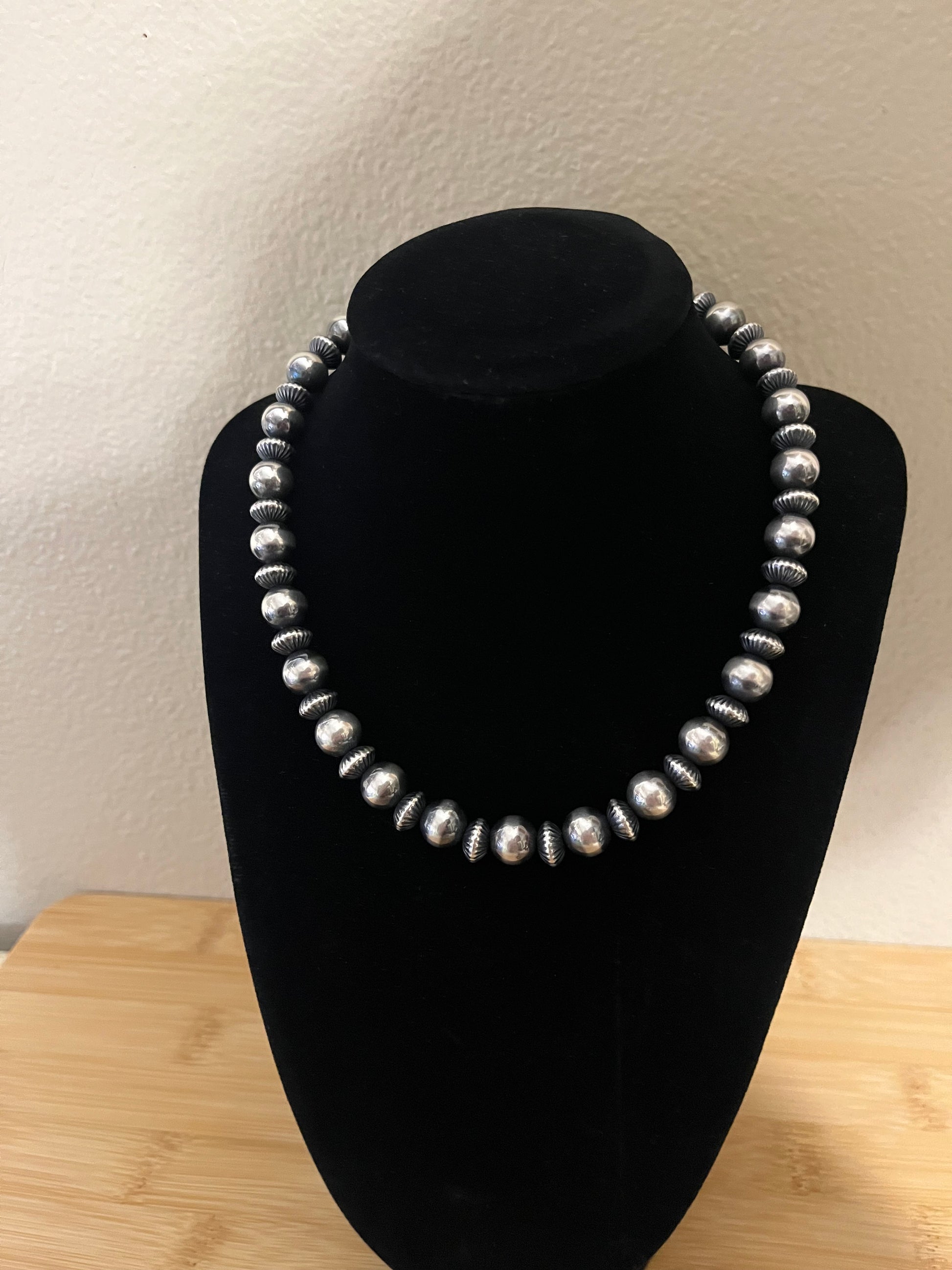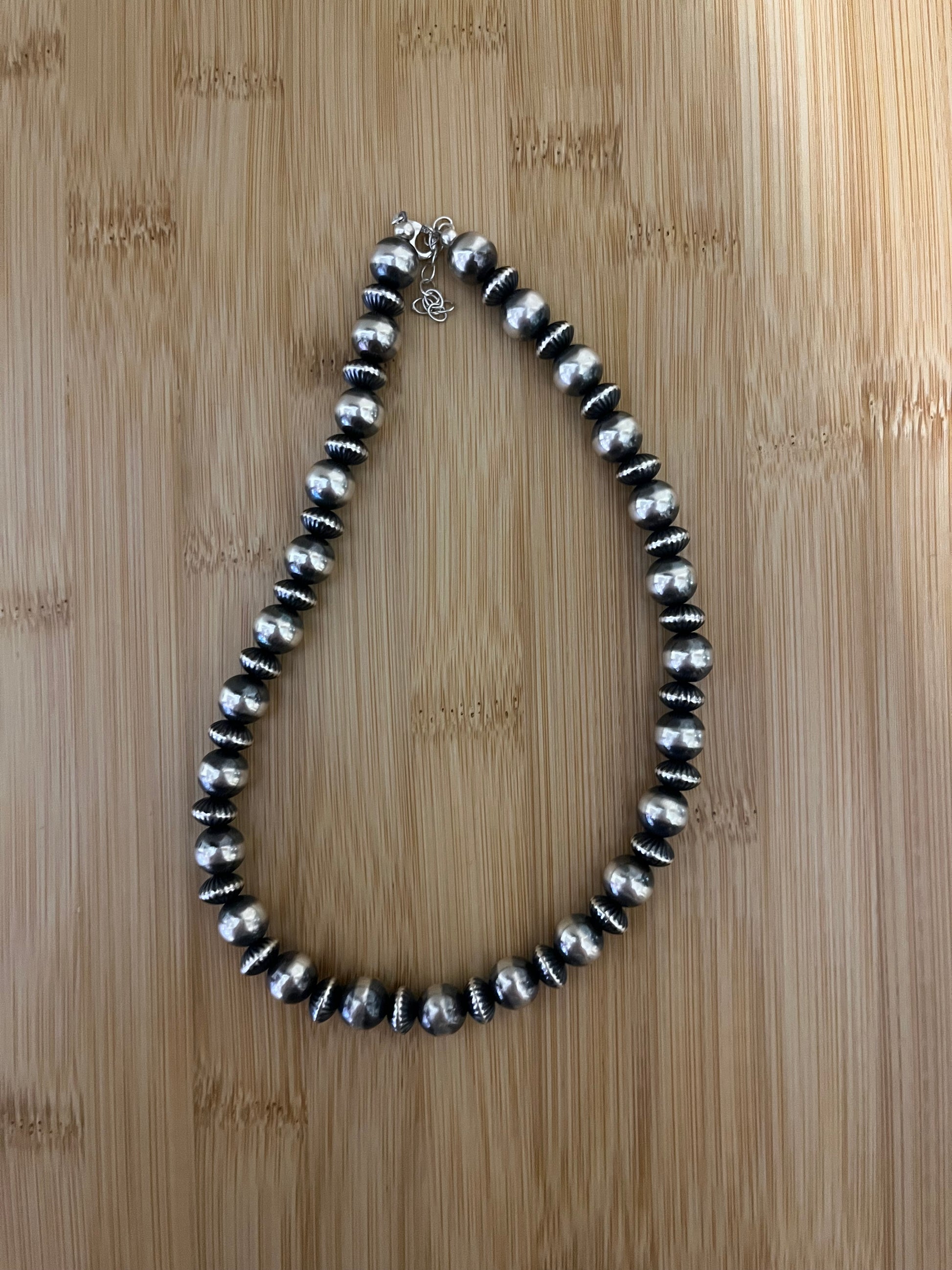 Chunky and textured are two things that make a perfect necklace. This beauty is made of 10mm & 9mm corrugated saucer Sterling Silver Navajo Pearls. 16” + 2” extender.