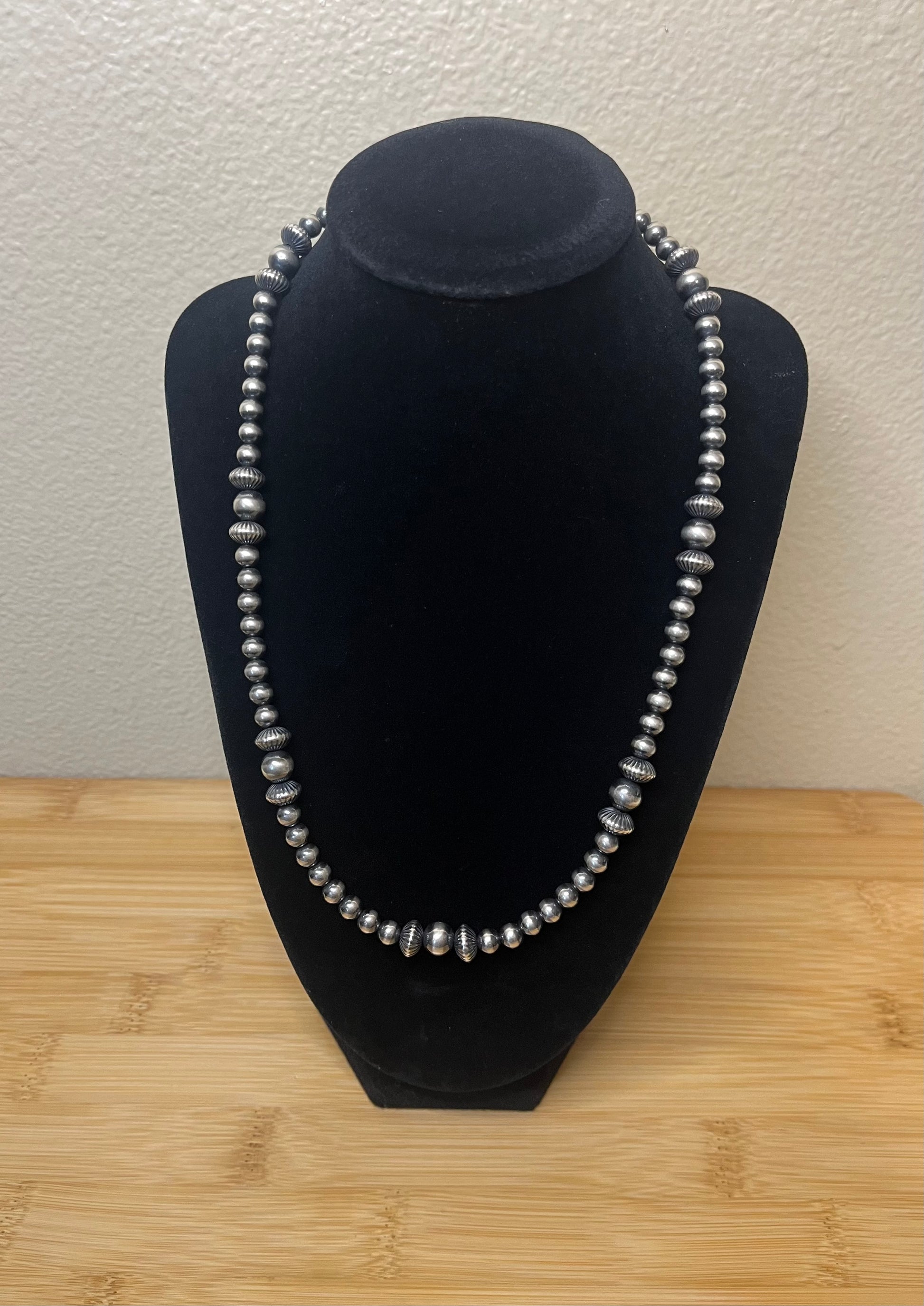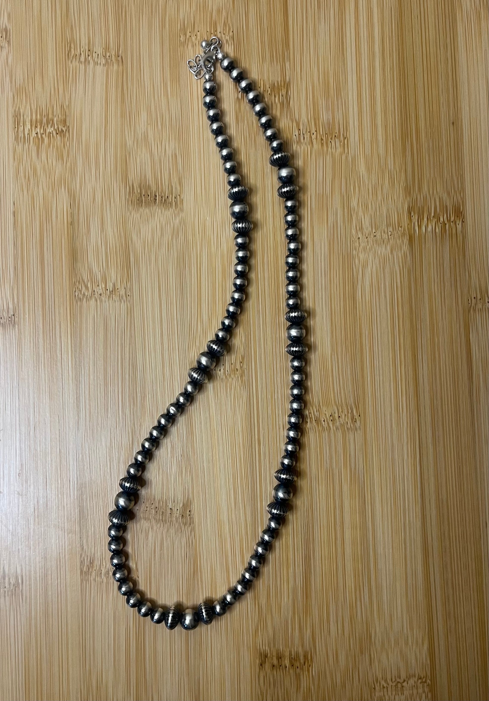 This necklace is perfectly pieced with 6mm & 8mm Sterling Silver Navajo Pearls with a 9mm textured Sterling Silver Navajo Saucers. 20” + 2” extender.