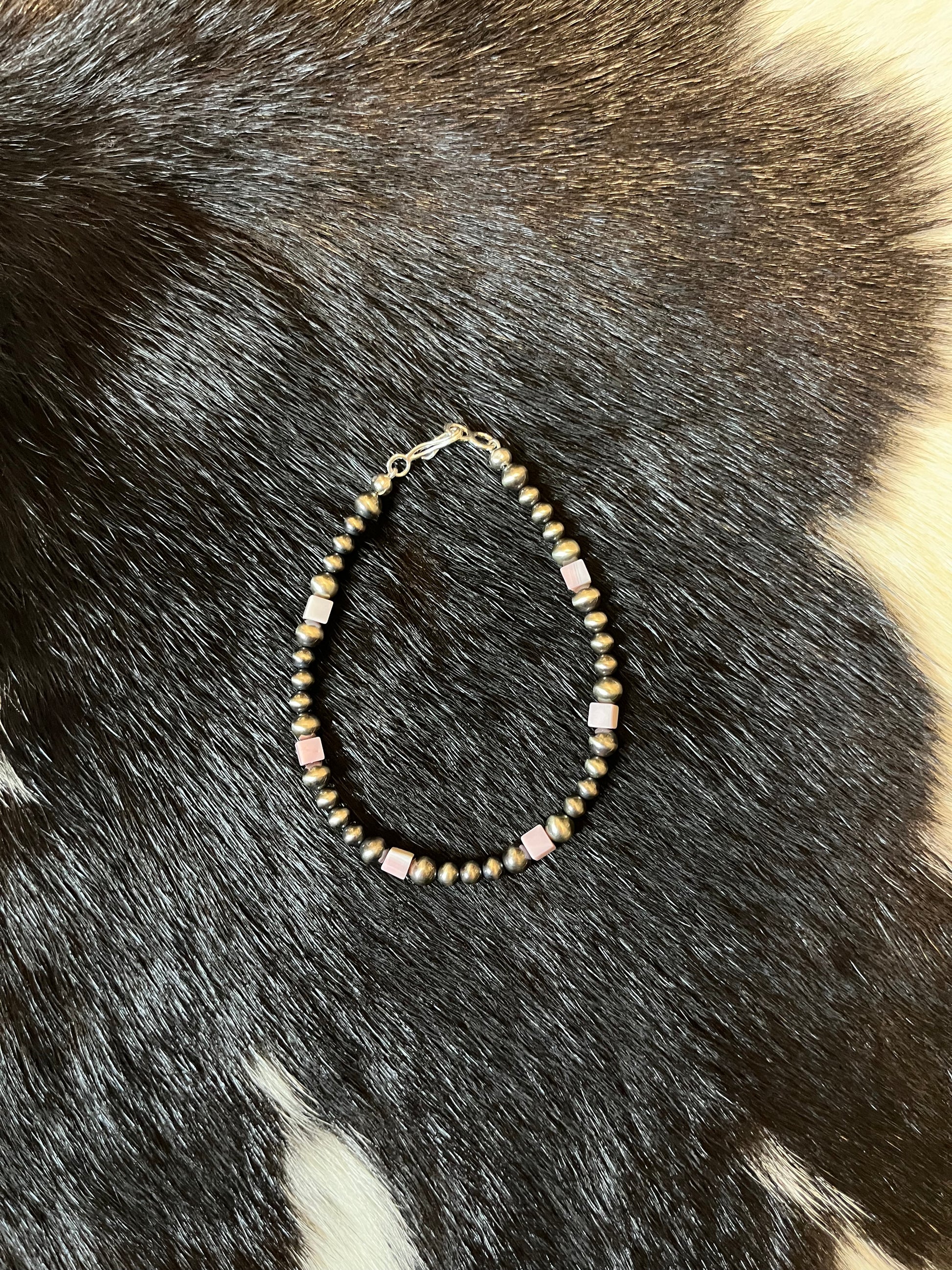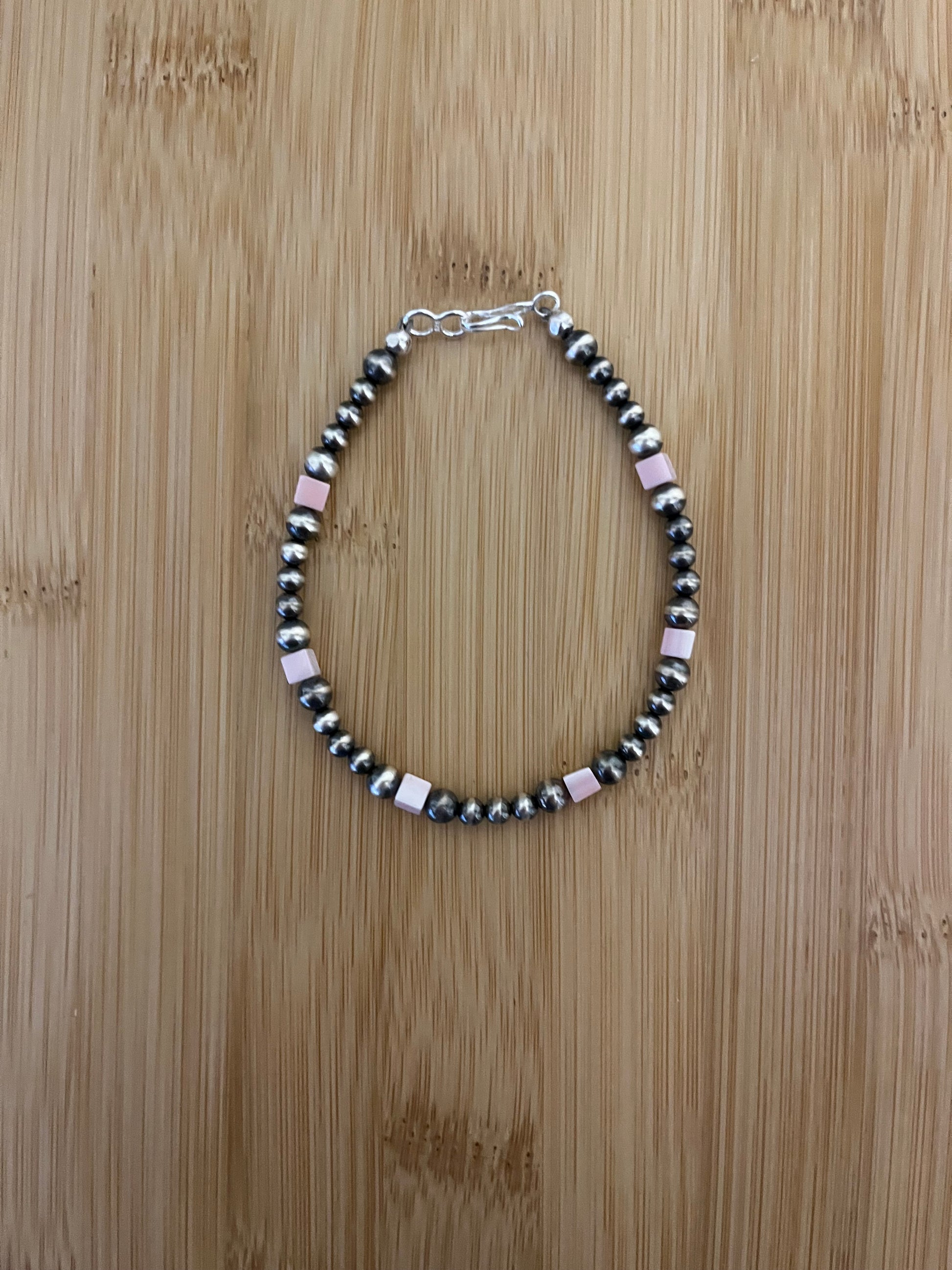 This bracelet is cute and has an adorable texture! Made of 4mm Square Queen Pink Conch beads, 5mm Sterling Silver Navajo Pearls, & 4mm Sterling Silver Navajo Pearls. 7 1/2”.