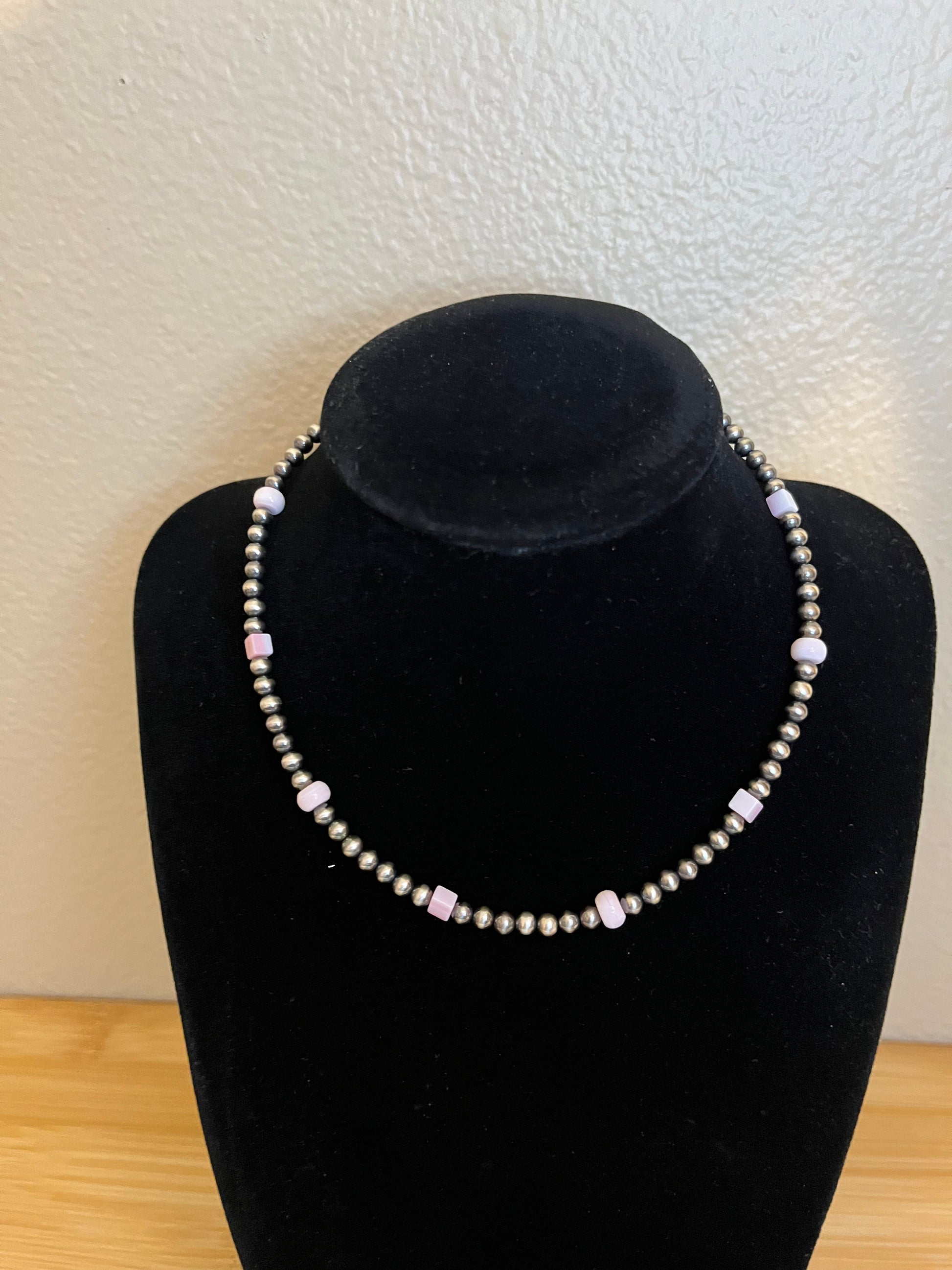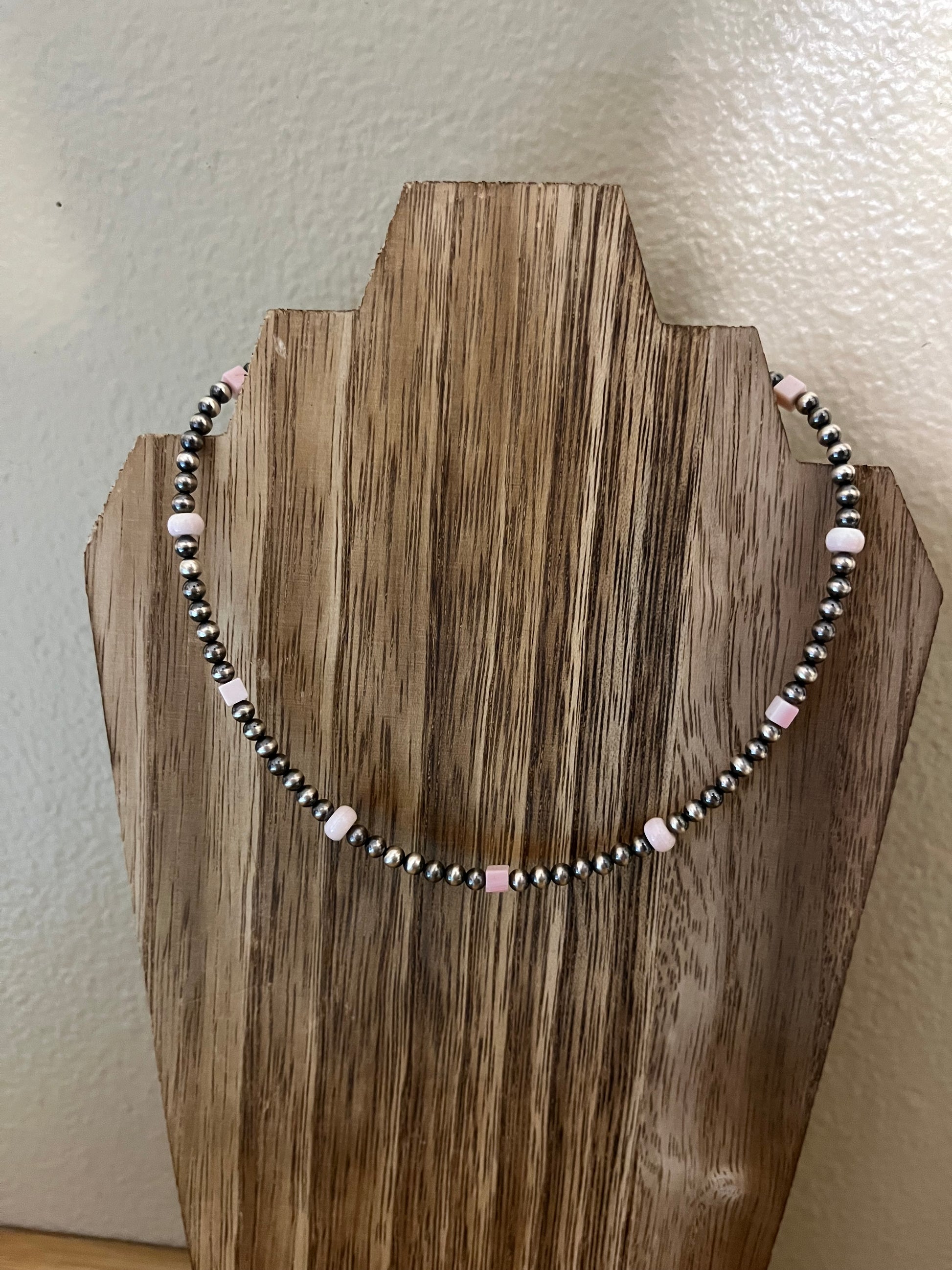 The uniqueness on this piece is beautiful! This necklace is a mixture of 4mm Square Queen Pink & 6mm Round Pink Conch. While also having 4mm Sterling Silver Navajo Pearls. 14” + 2” extender.