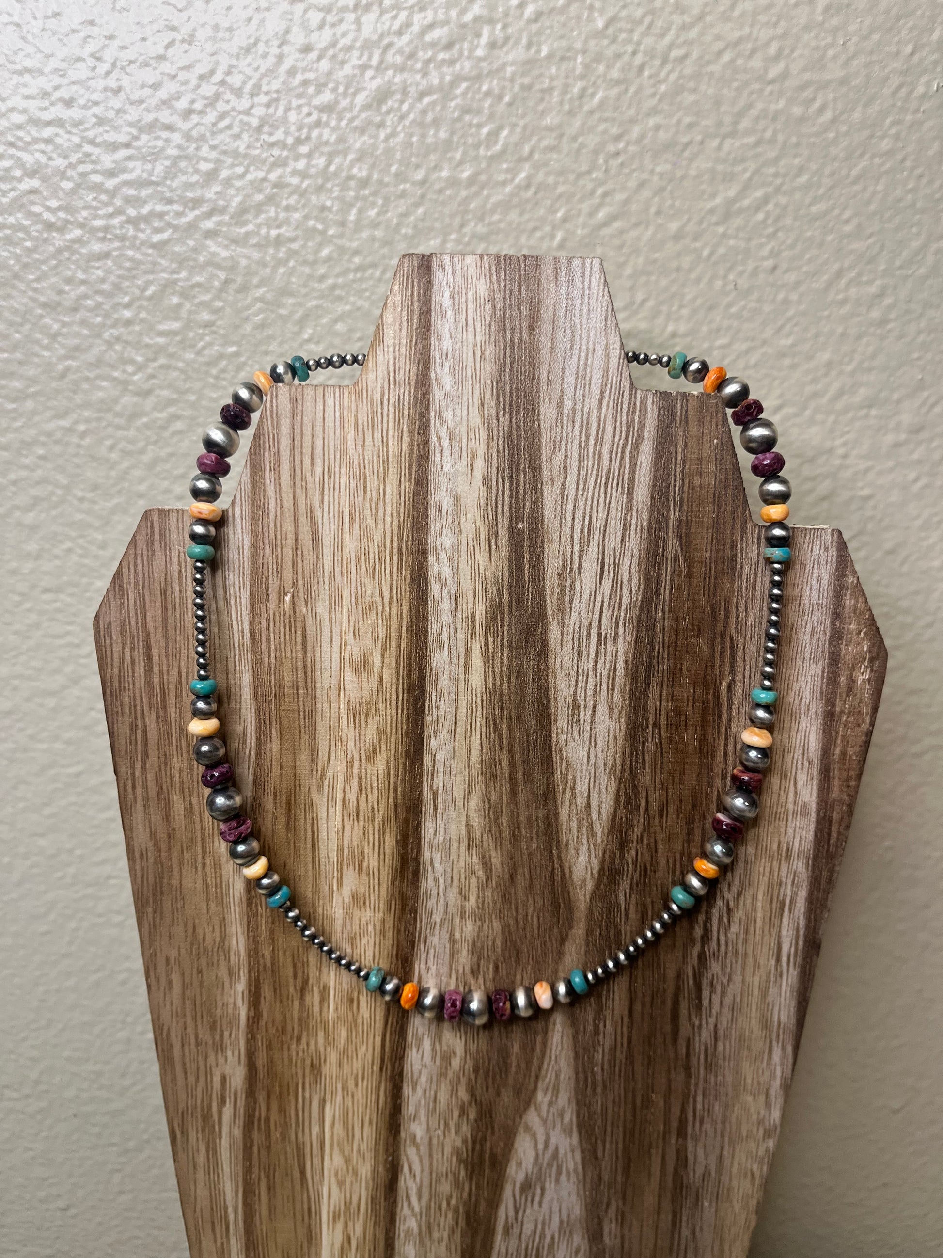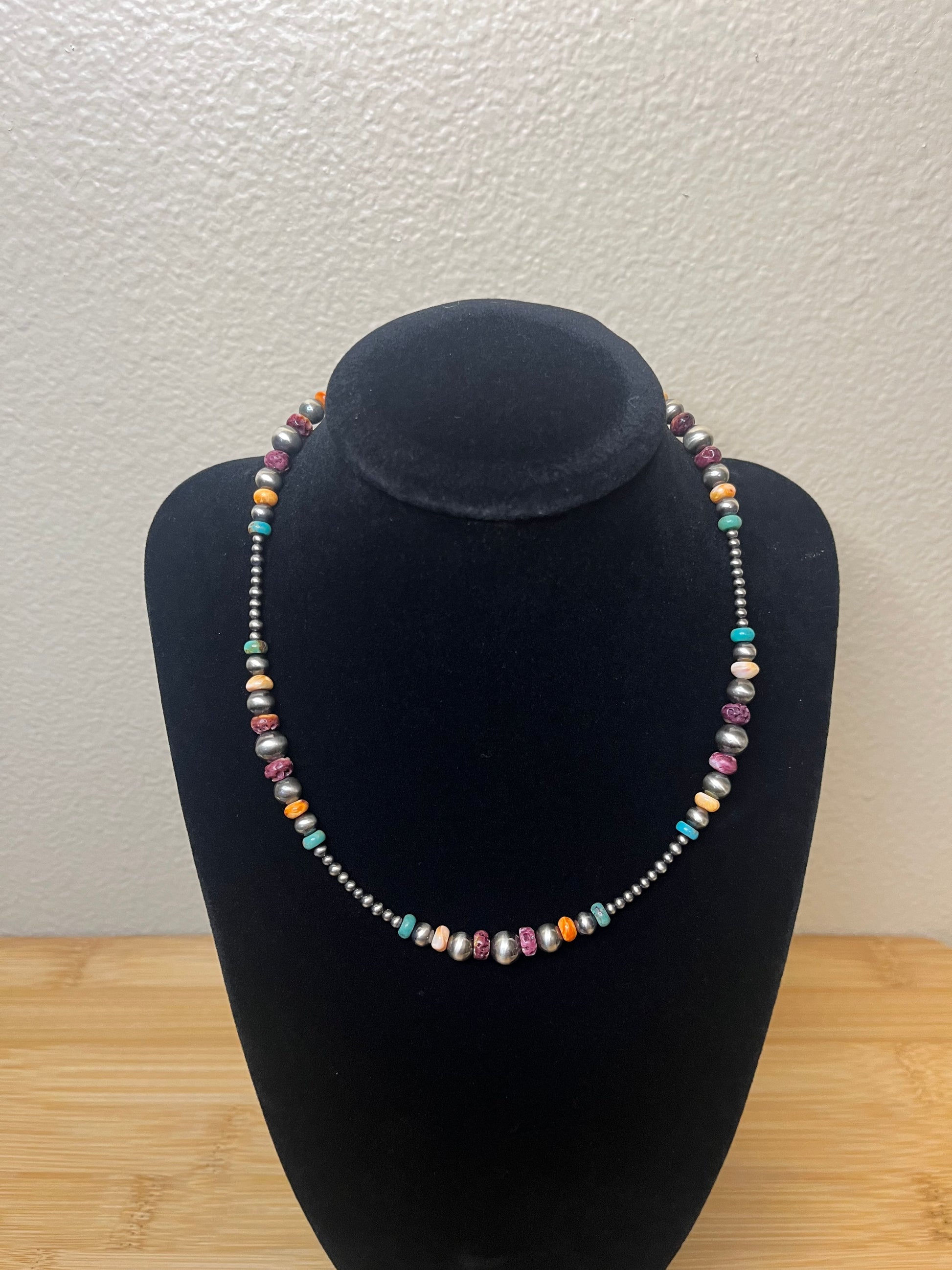 It’s all about color! This necklace is mixed with 6mm Turquoise Roundel, 6mm Spiny Oyster Roundel, & 6mm Purple Spiny Oyster Roundel. It has 3mm, 5mm, 6mm, & 7mm Sterling Silver Navajo Pearls. 16” + 2” extender.