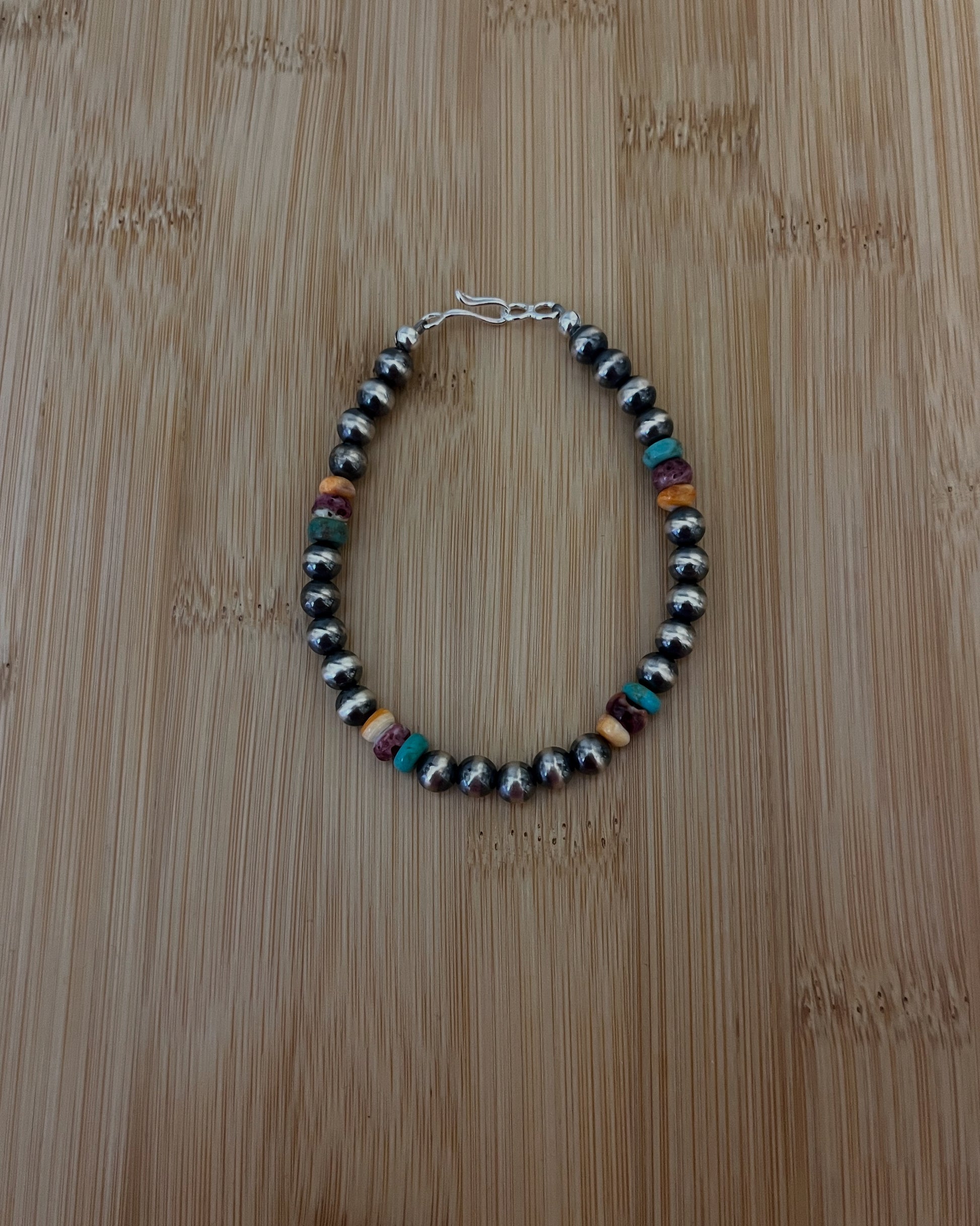 This bracelet is so colorful and cute! This fun looking bracelet is made of 6mm Sterling Silver Navajo Pearls & 6mm Purple Spiny Oyster, 6mm Orange Coral, & 6mm Turquoise. 7 1/2”.