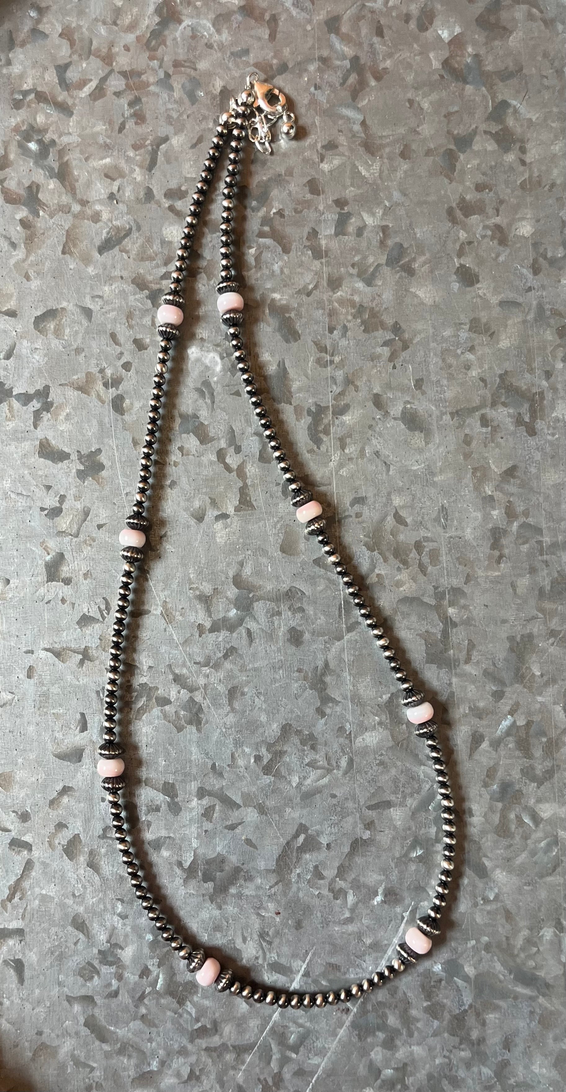 This necklace is simple and pretty! 20” + 2” extender pieced with 3mm Sterling Silver Navajo Pearls, 5.7x3.5mm Sterling Silver Navajo Saucers Textured, & 6mm Pink Conch beads.