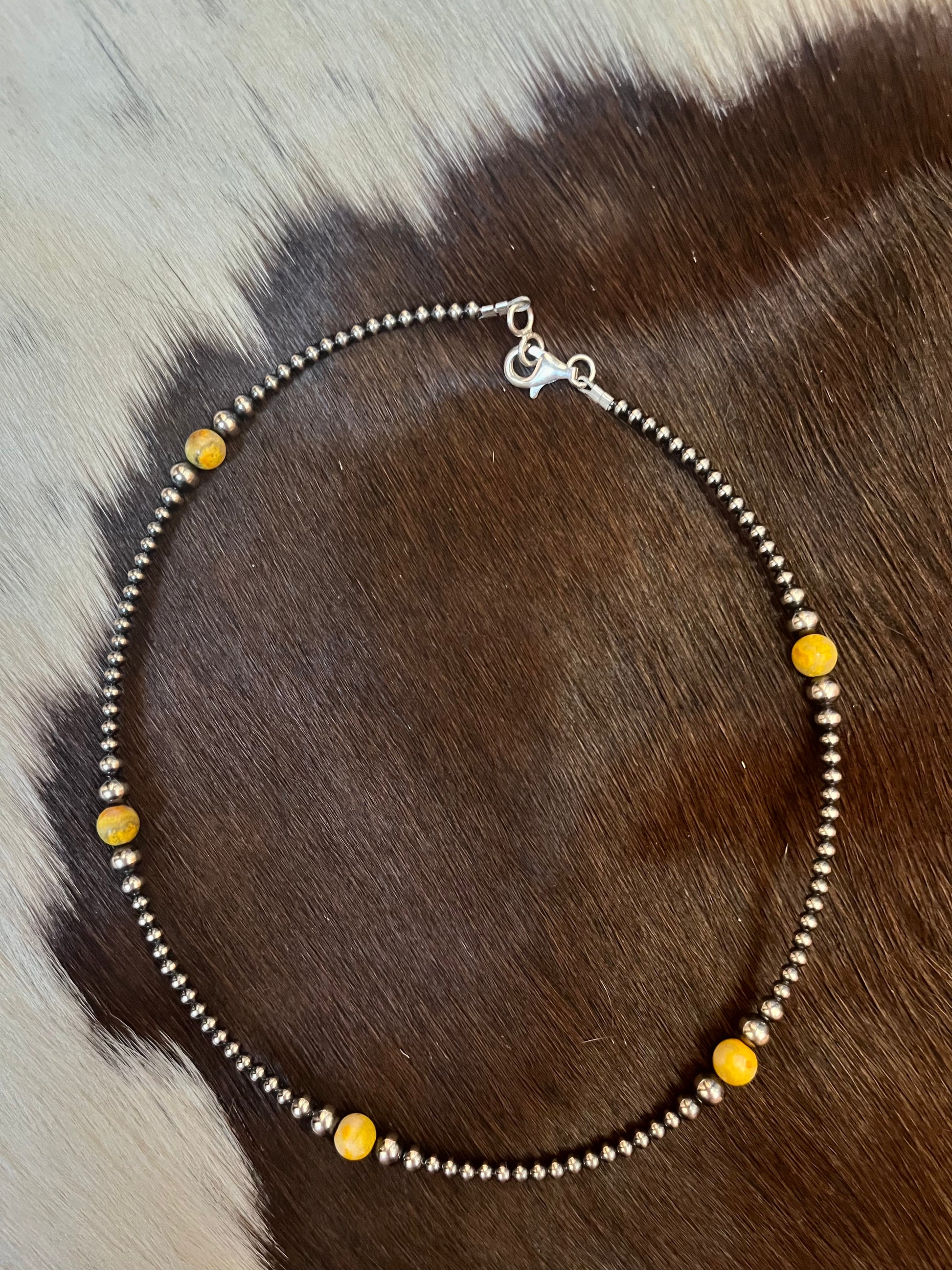 An amazing color popping piece! Has 6mm Bumblebee Jasper beads, tapered with 3mm, 4mm, & 5mm Sterling Silver Navajo Pearls. 16” + 2” extender.