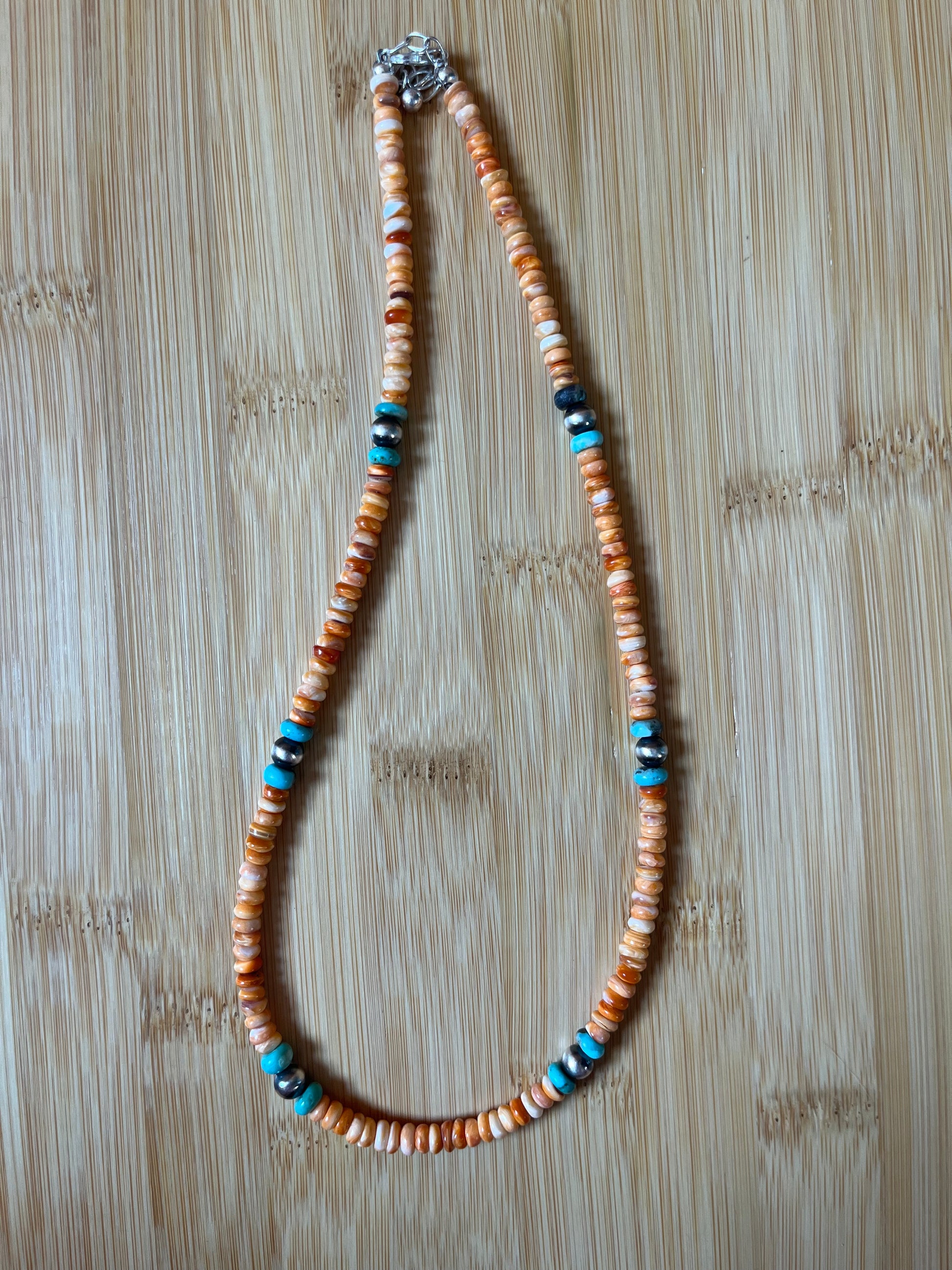 This necklace adds color to any stack! This necklace is perfectly pieced with 6mm Spiny Oyster Roundel, 6mm Turquoise Roundel, & 6mm Sterling Silver Navajo Pearls. 18” + 2” extender.