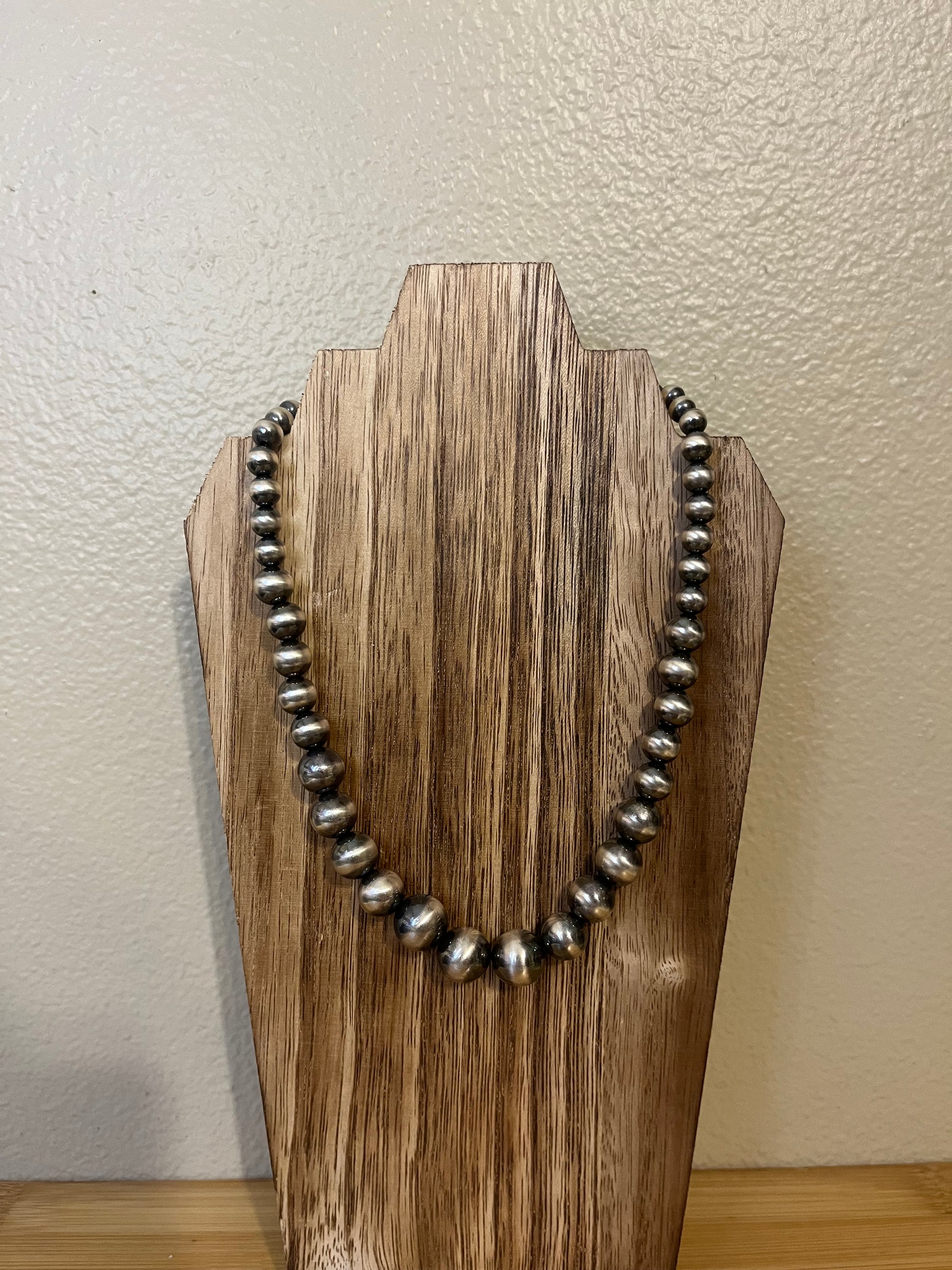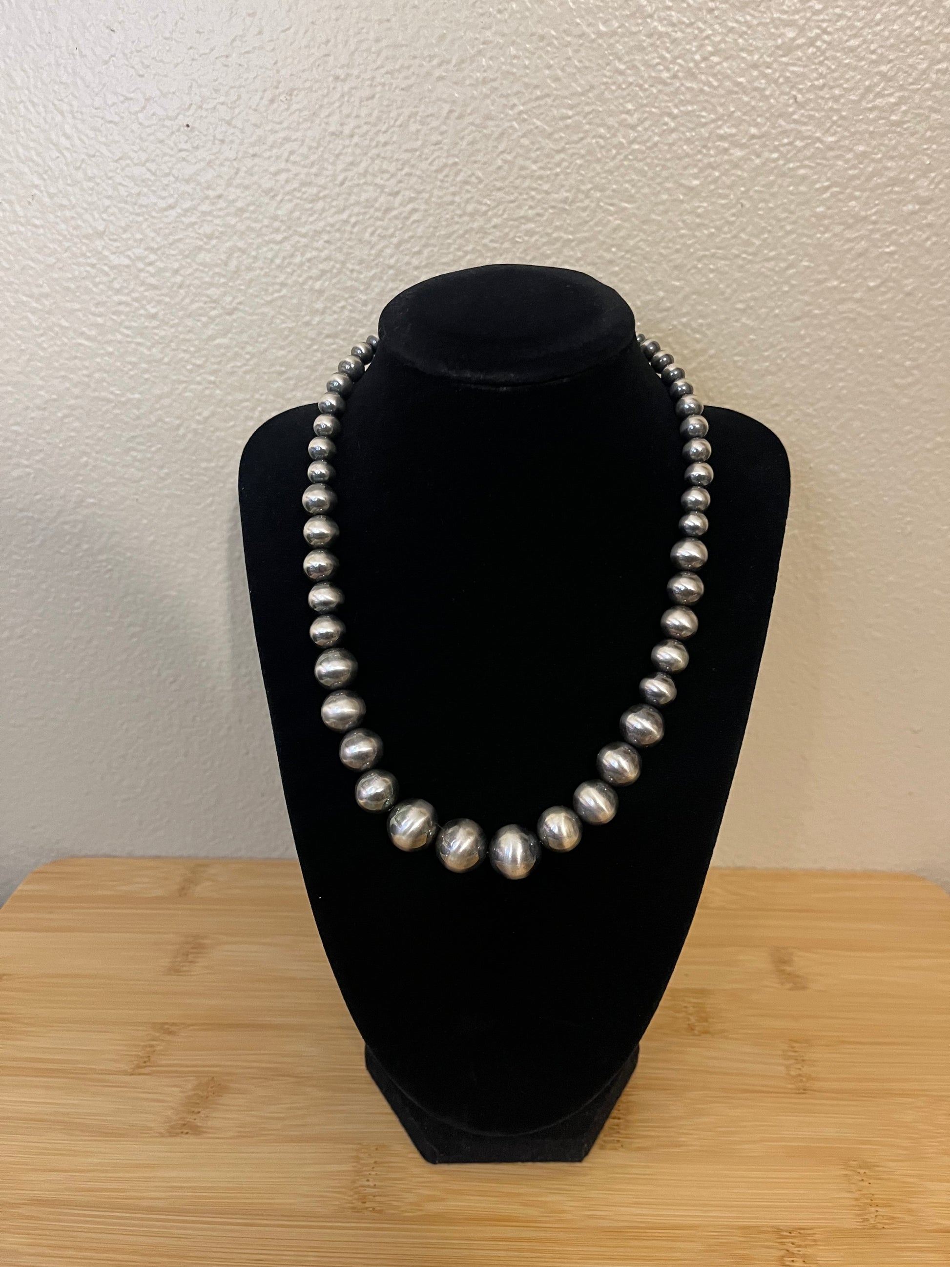 This is a perfect graduated Navajo Pearl necklace. This is strung with 14mm, 12mm, 10mm, 8mm, 7mm, & 6mm Sterling Silver Navajo Pearls. 18” + 2” extender.