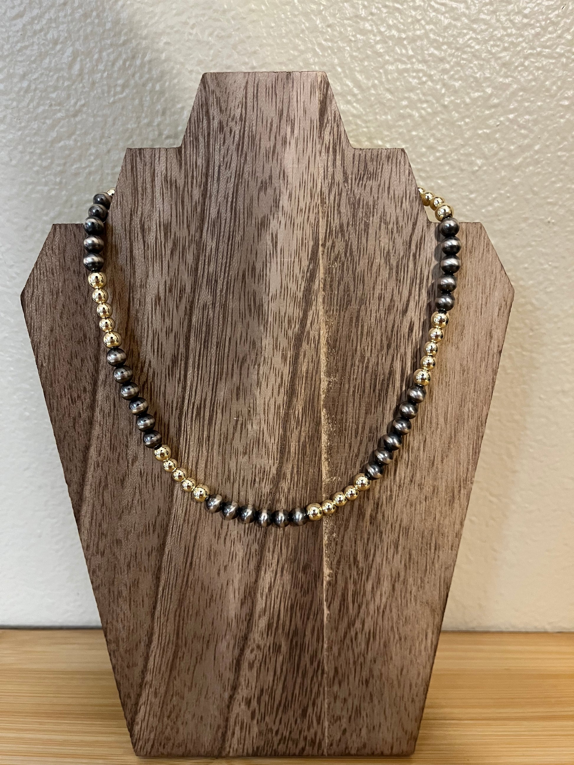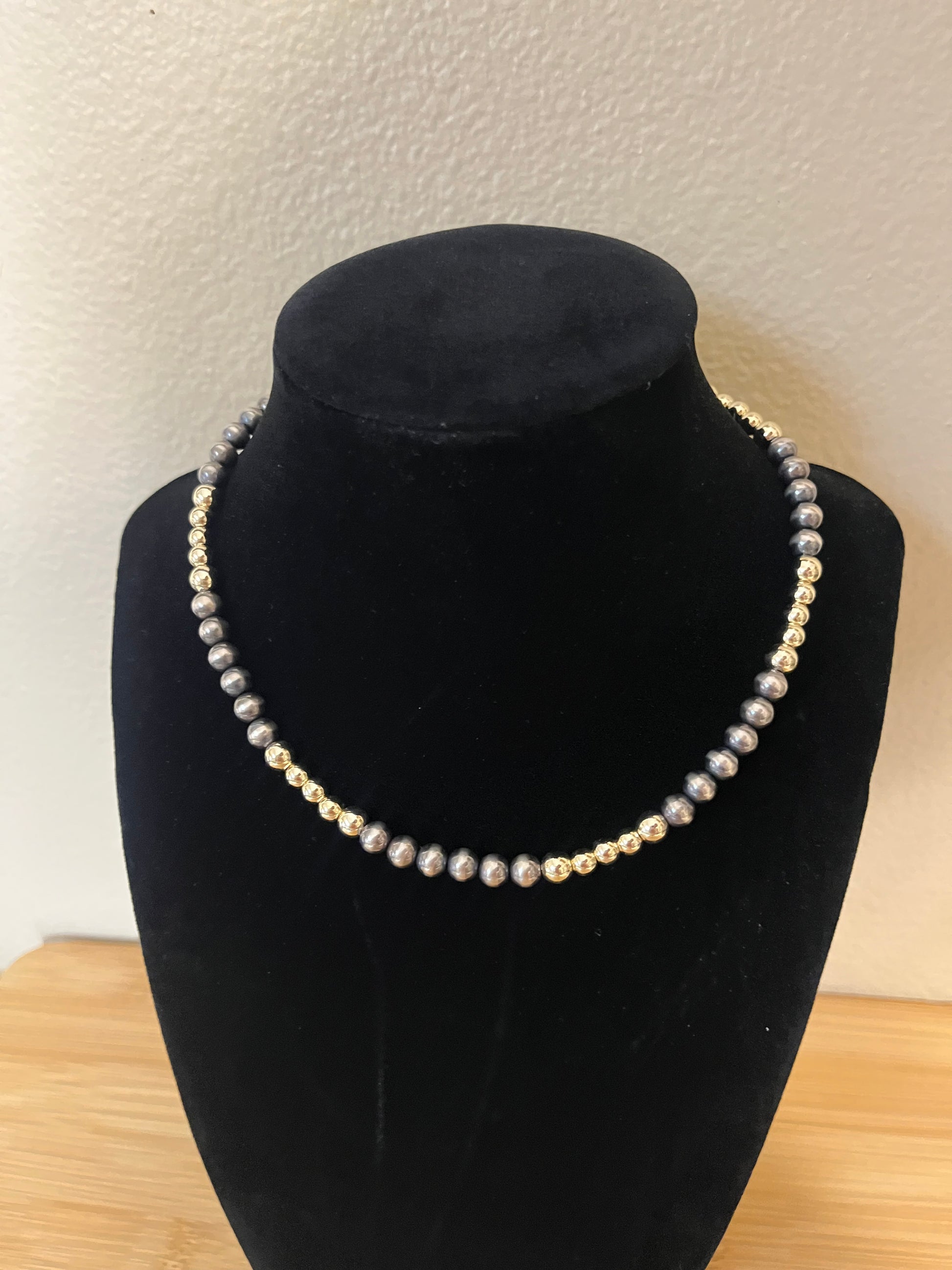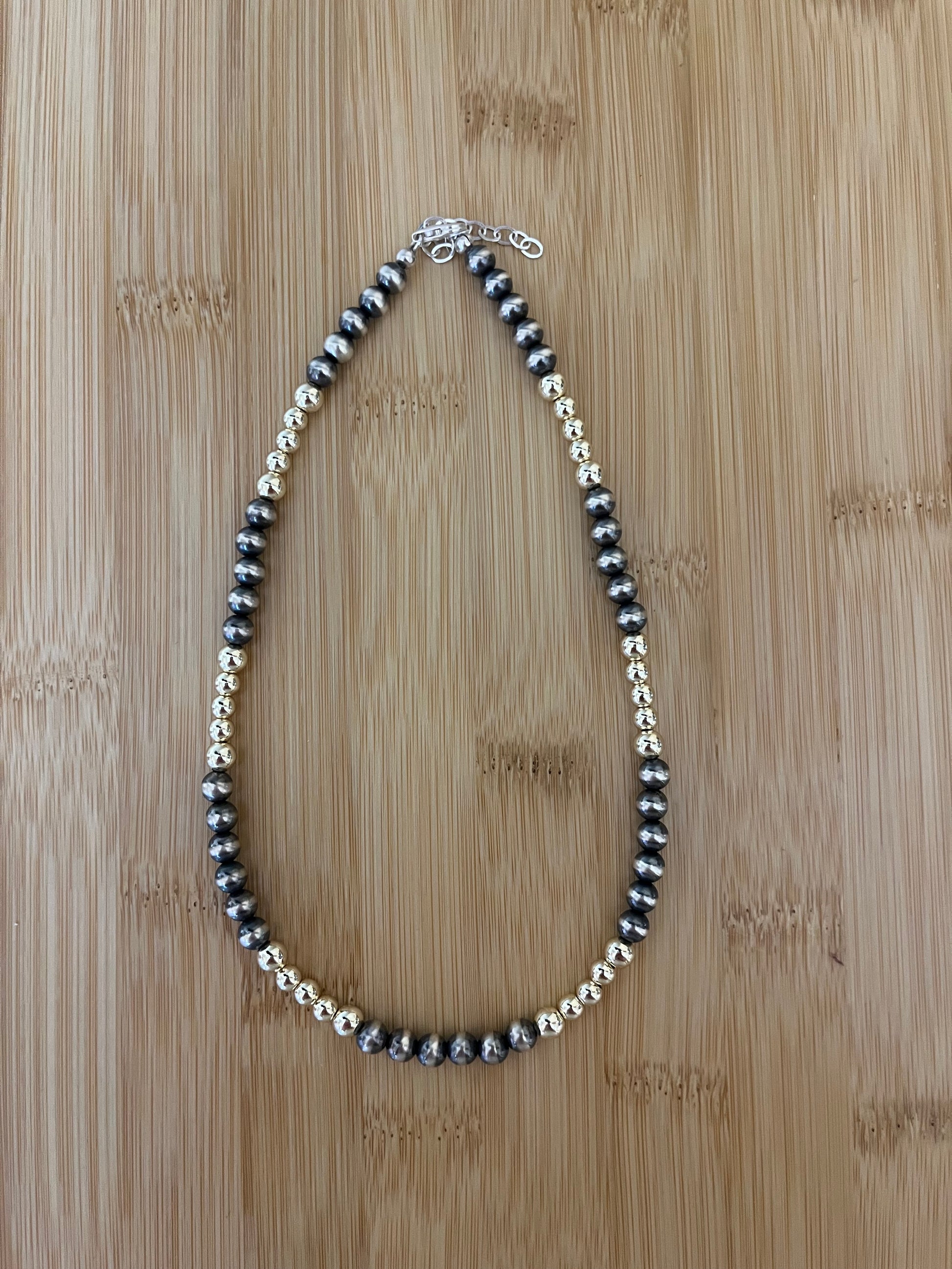 Mixed metals pieces make everything cuter! This necklace is made with 6mm Sterling Silver Navajo Pearls & 5mm & 6mm 14k Gold Filled beads. 16” + 2” extender.
