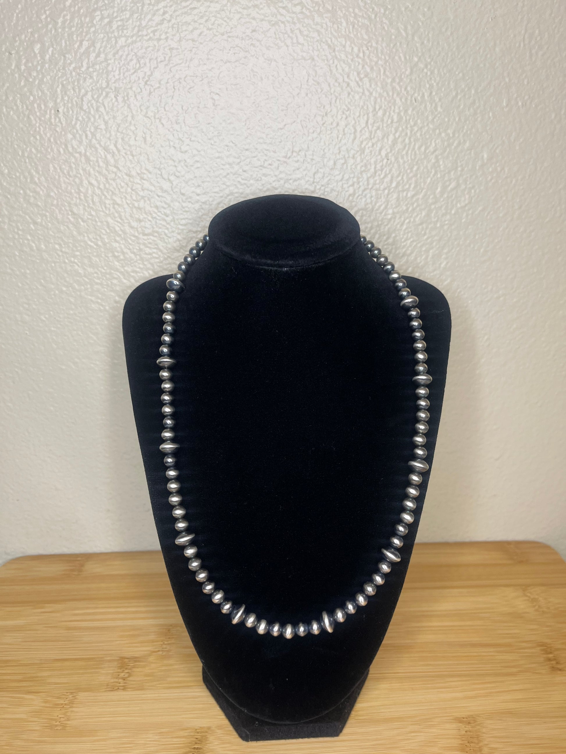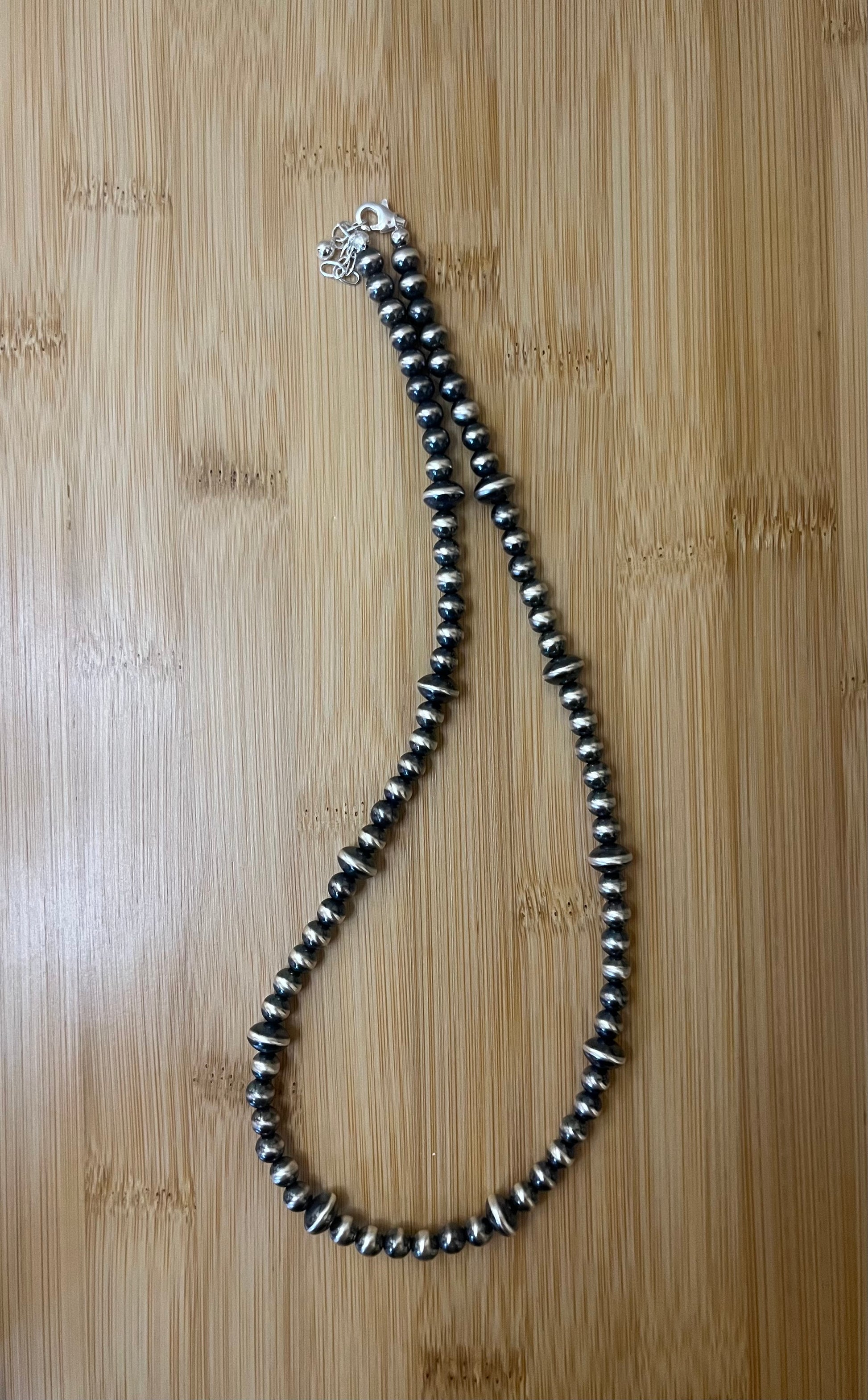 This necklace is simple and stunning! This necklace is made with 6mm Sterling Silver Navajo Pearls & 9mm Sterling Silver Navajo Pearl Saucers. 20” + 2” extender.