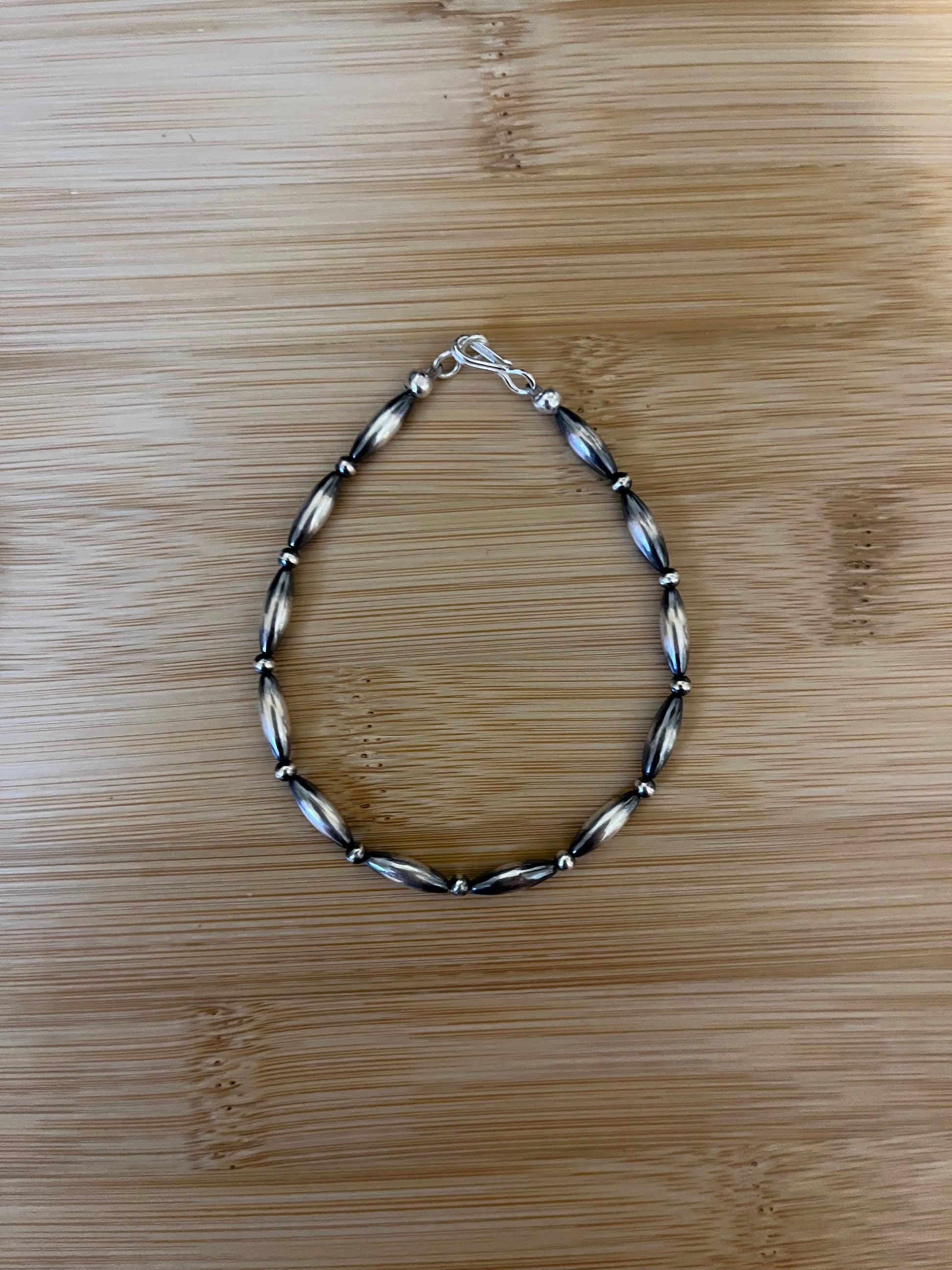 A bracelet that is entirely unique. This bracelet is 7.5” long and has 3mm Sterling Silver Navajo Pearls and 4x12mm Sterling Silver Navajo Torpedo beads.