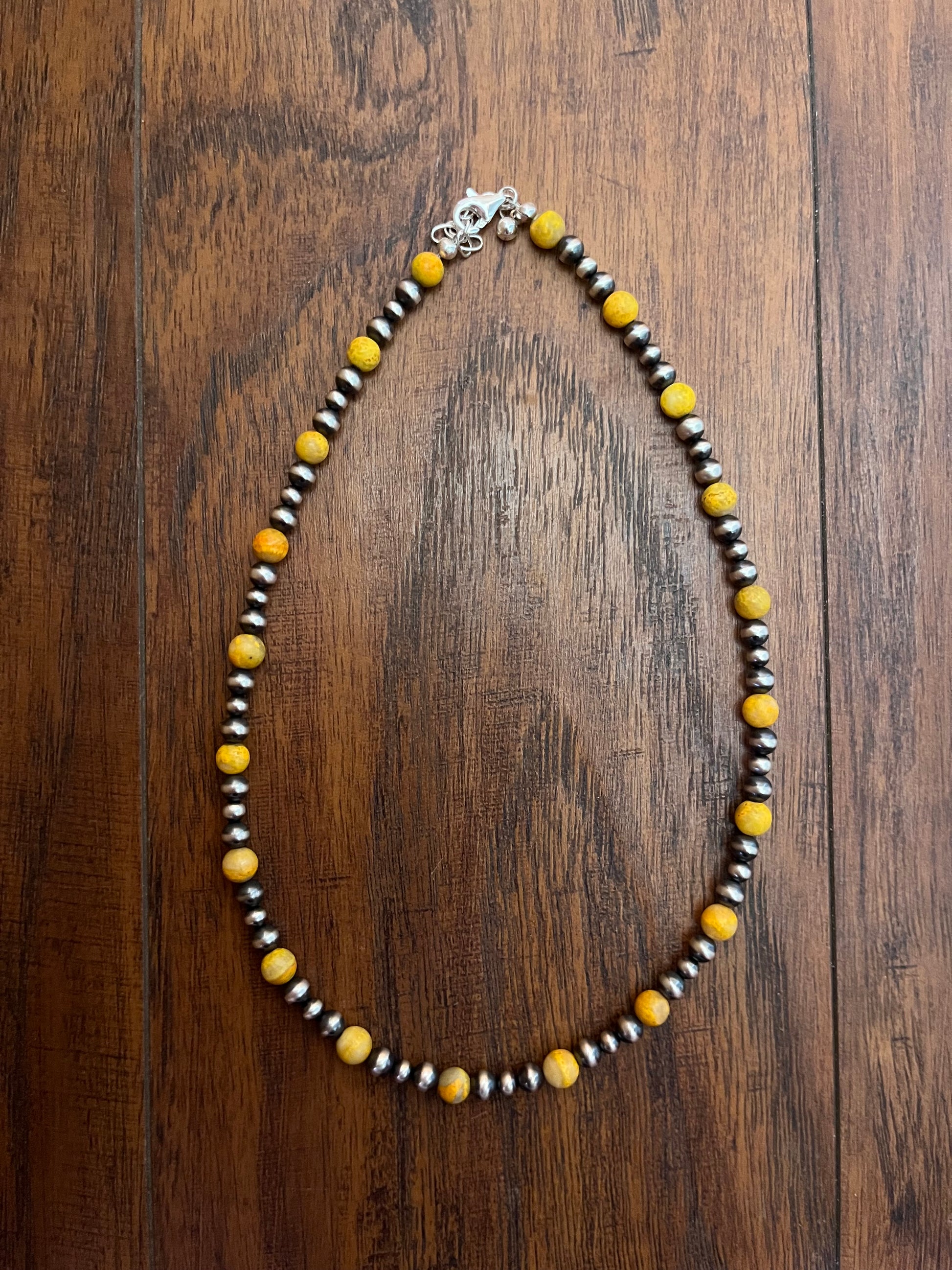 The color pop on this necklace is so cute! This Bumblebee Jasper 6mm beads aes mixed with 5mm & 4mm Sterling Silver Navajo Pearls. 16” + 2” extender.