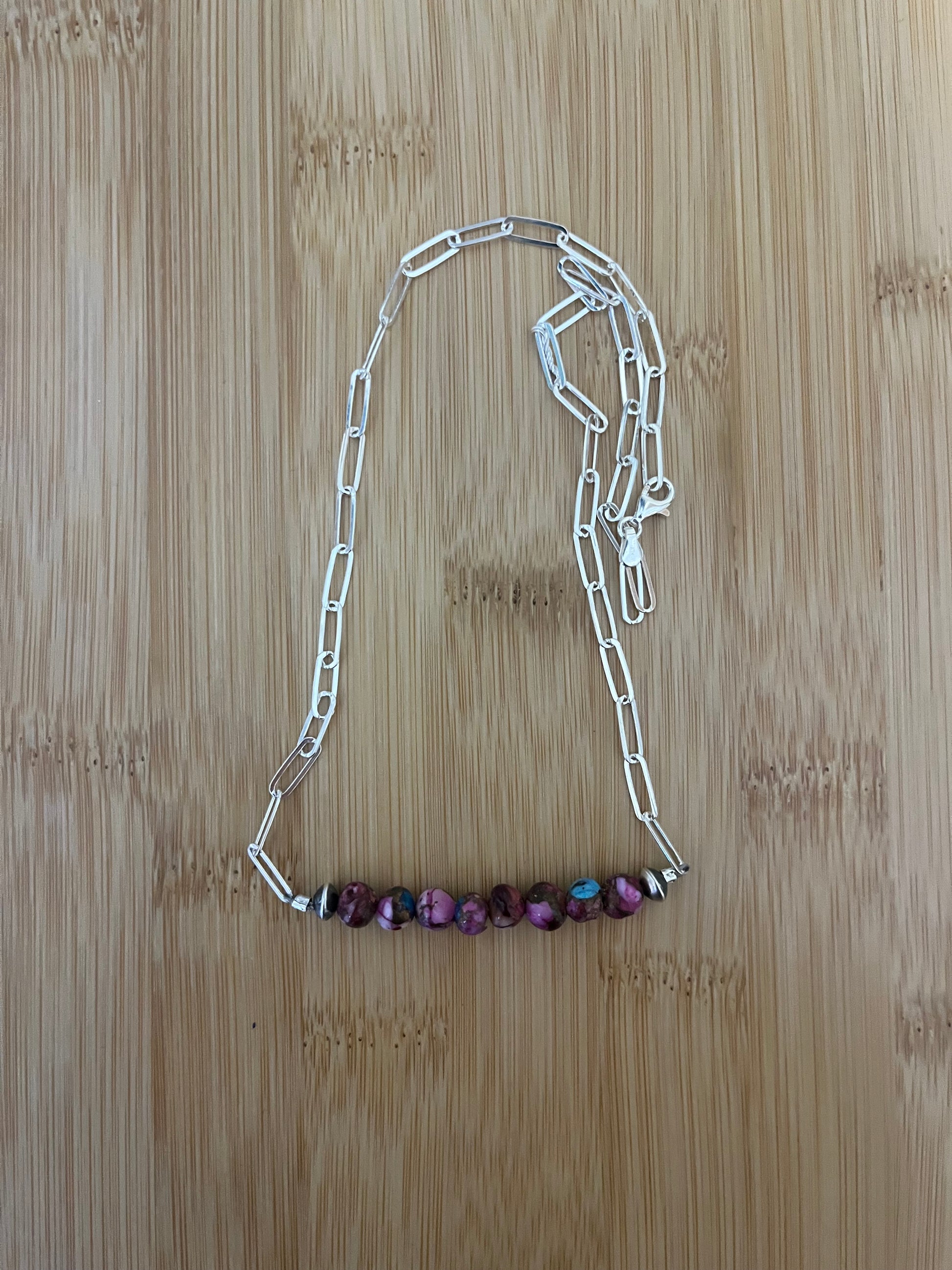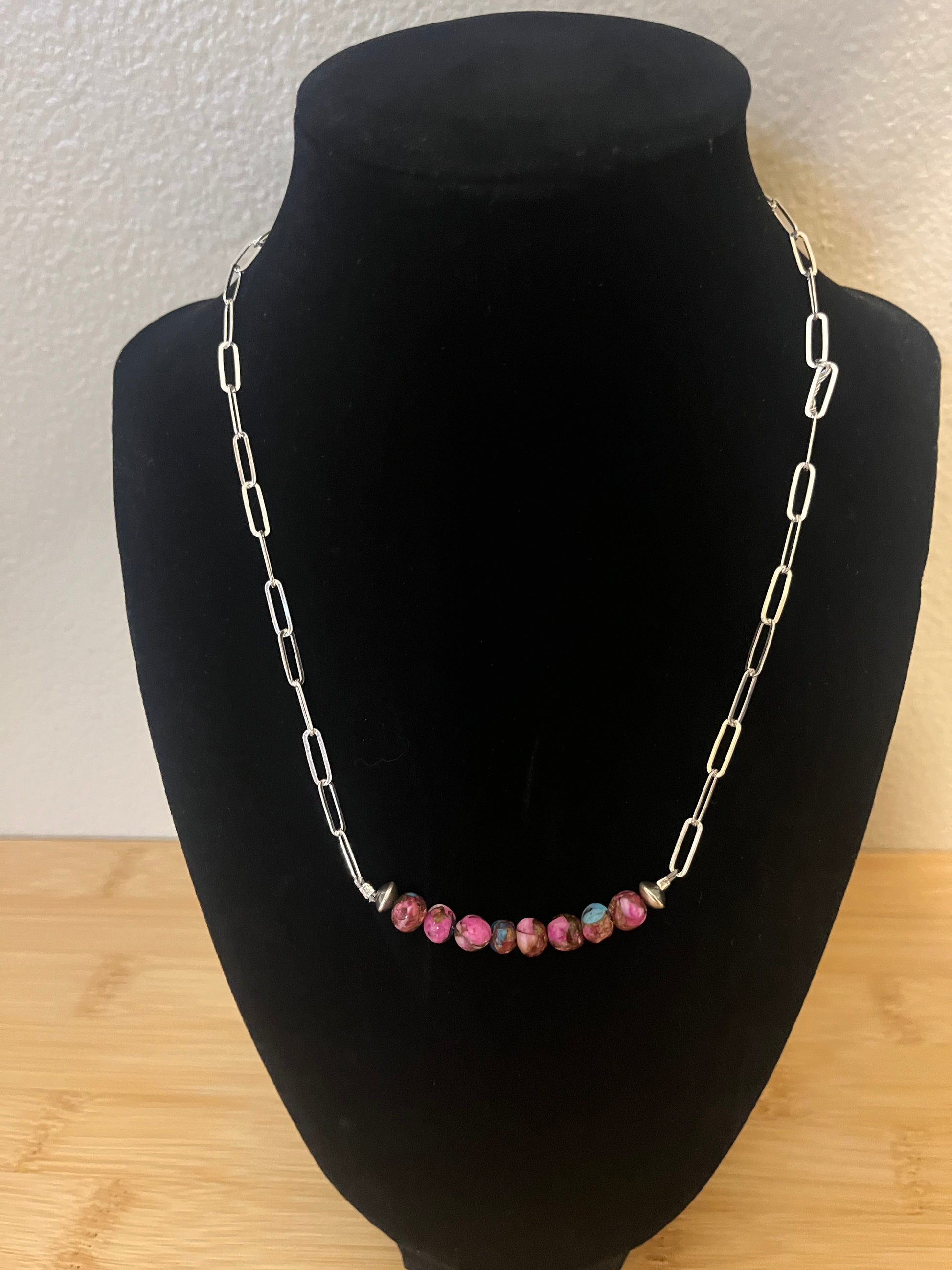 A cute and colorful necklace!! This adorable piece is made of 5.7x3.5 saucer Sterling Silver Navajo Pearls & 6mm Dahlia with a 16” Sterling Silver Paperclip Chain.