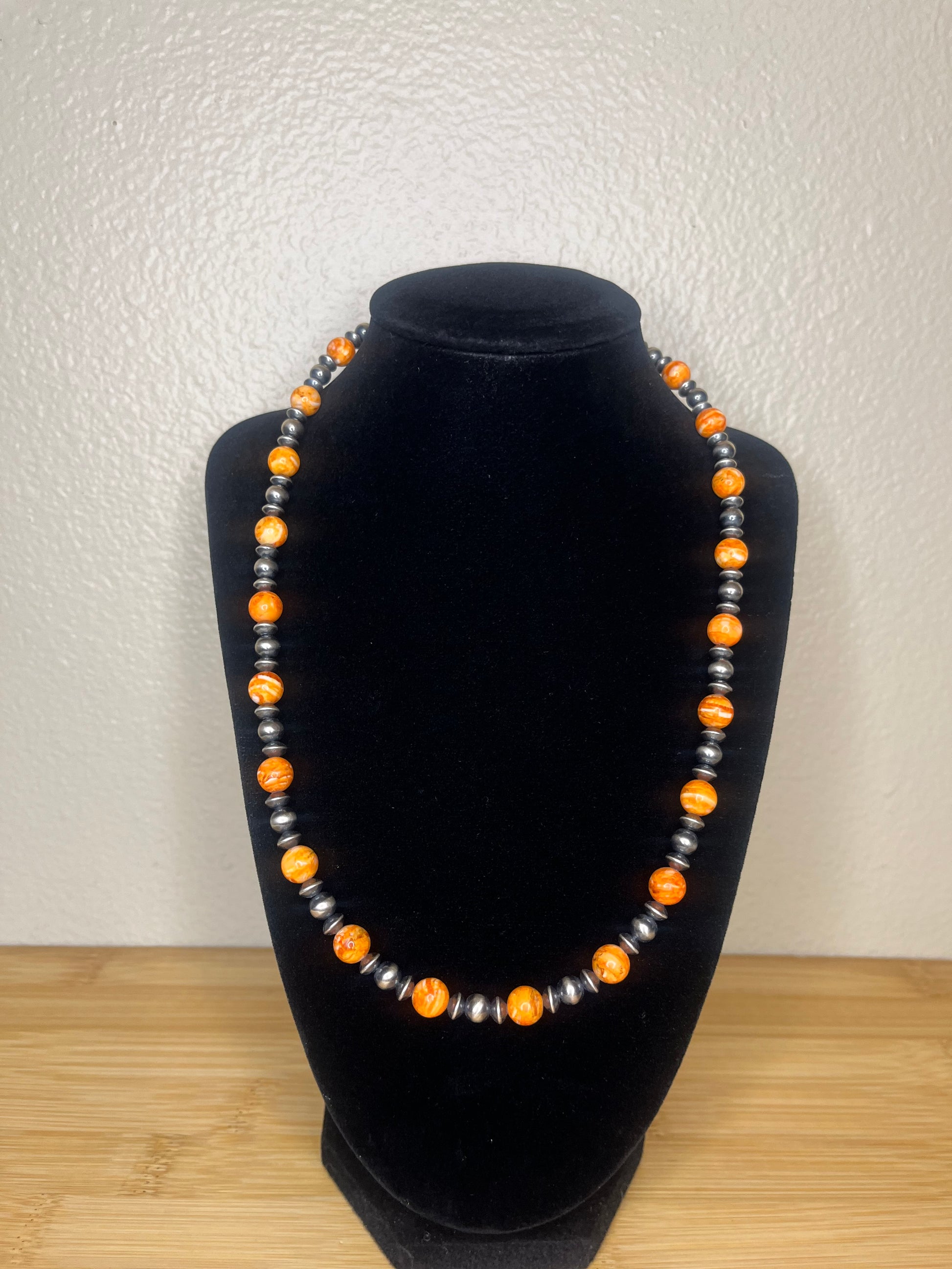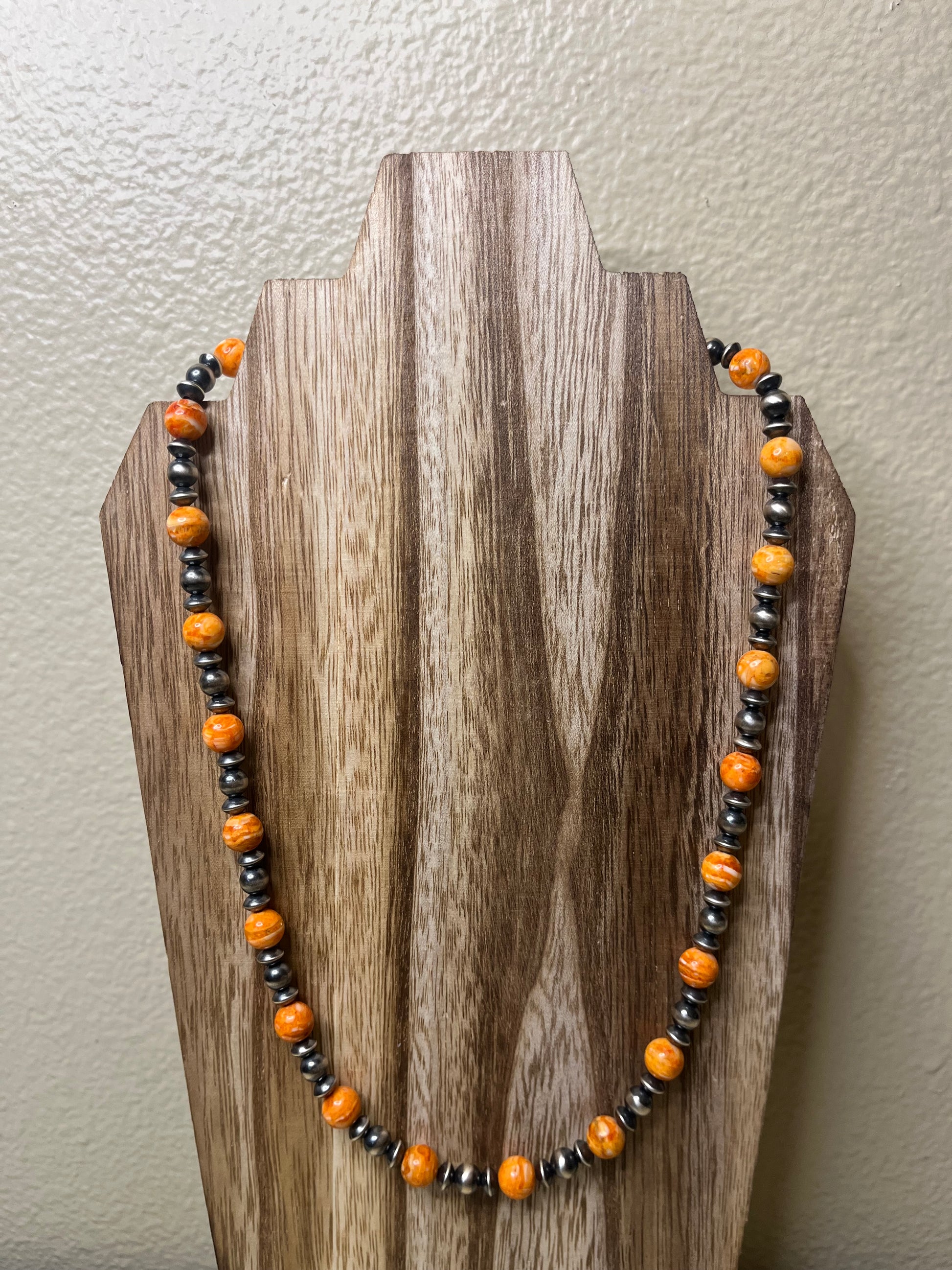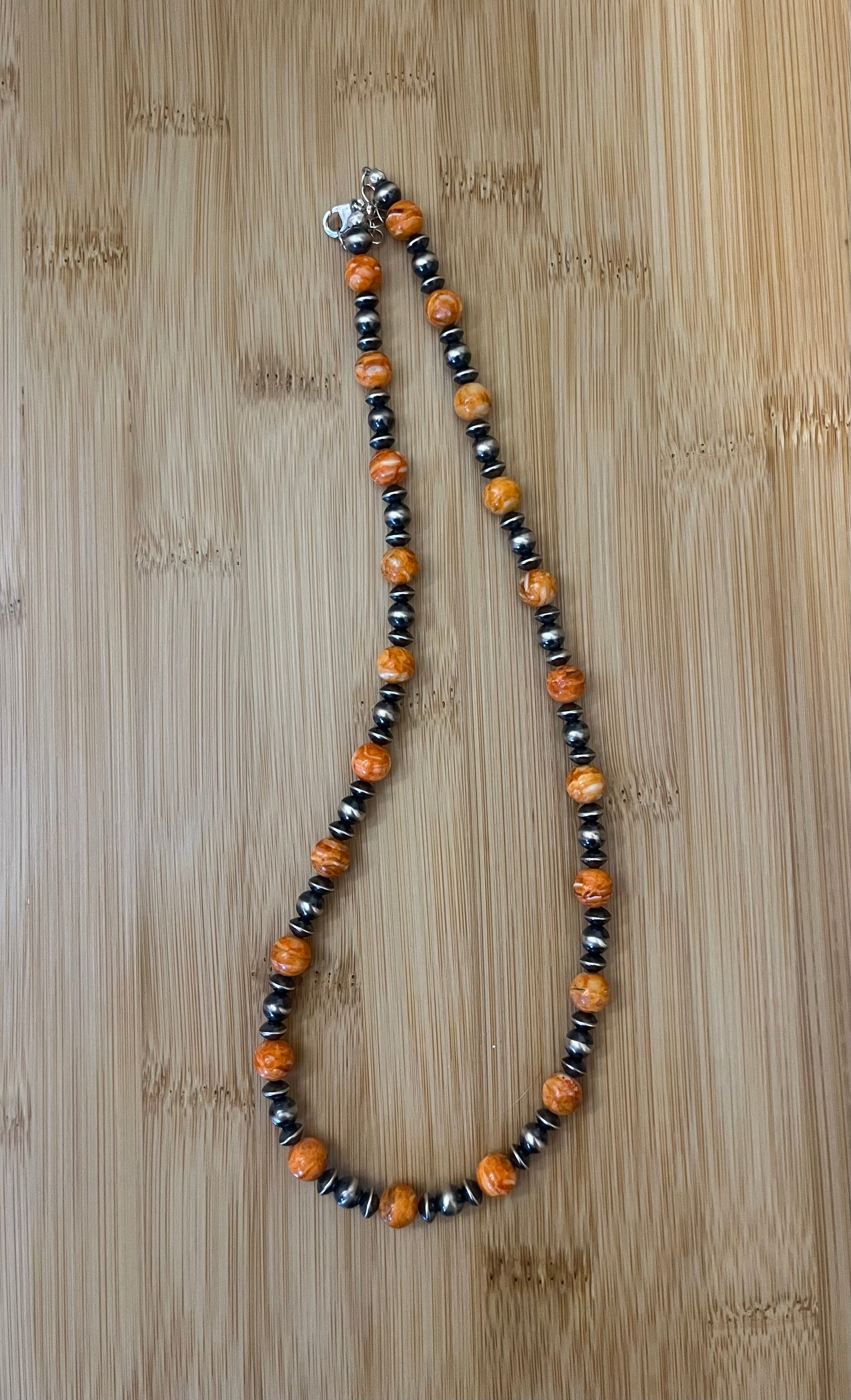 The color pops in this necklace! This is made of stunning 8mm Spiny Oyster patterned with 5.7x3.5 Navajo Saucers and 6mm Sterling Silver Navajo Pearls. 20” + 2” extender.